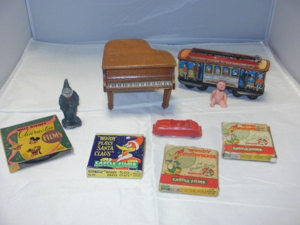 BOX LOT - TOYS AND 8 MM FILM SPOOLS