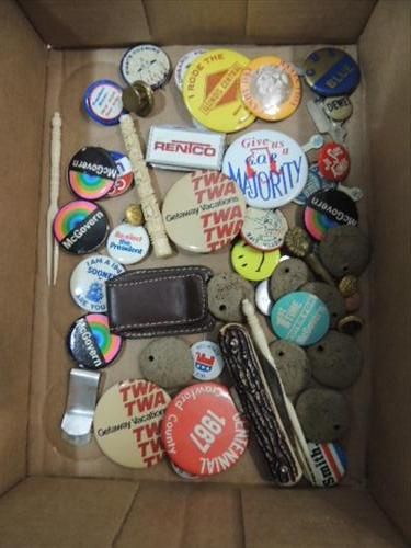 BOX LOT VINATGE COLLECTIBLES: 1970S POLITICAL BUTTONS, POCKET KNIFE, GOLD TONE MILITARY BUTTON, AND MUCH MORE.  AS SHOWN.  VIEW PICTURE FOR DETAIL.