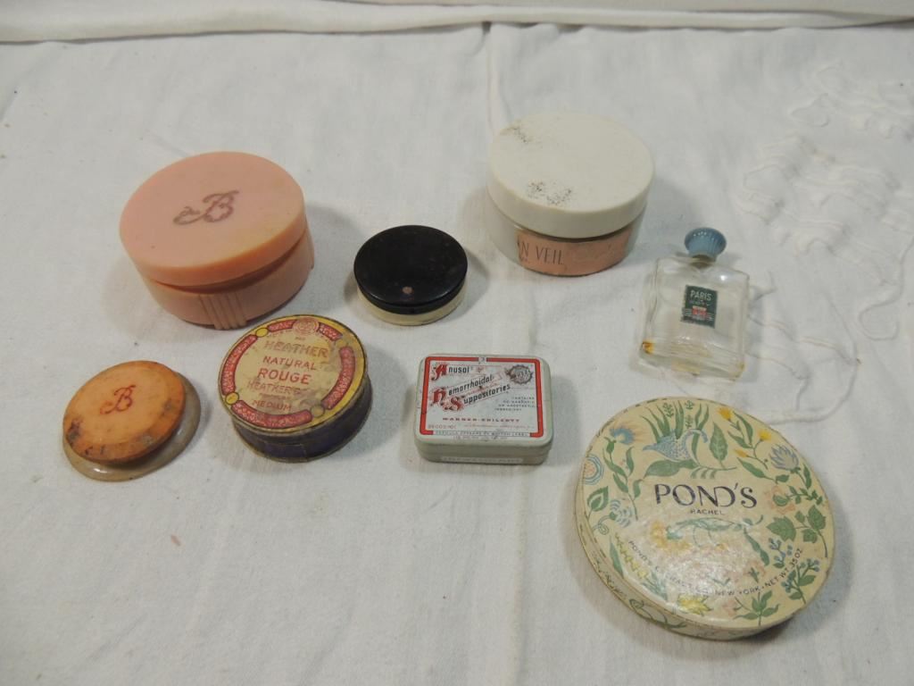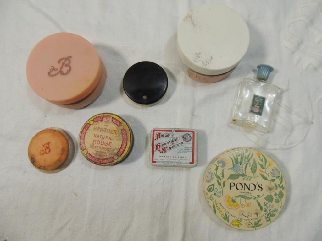 COSMETICS AND PURFUMES, ROUGE, SAMPLE TIN, BOTTLE AS SHOWN SEE PHOTO FOR MORE DETAILS.
