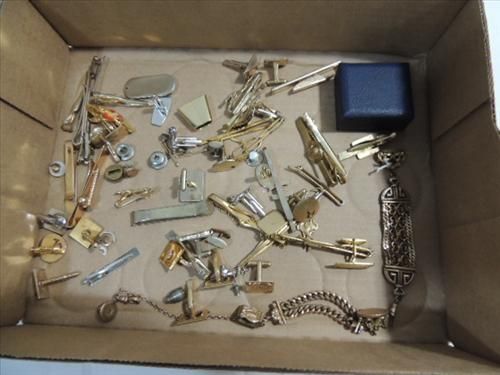 BOX LOT VINTAGE MENS GOLD TONE TIE CLASP & CUFF LINKS. THERE ARE TWO OLD WATCH FOPS. AS SHOWN. VIEW PICTURE FOR DETAIL.