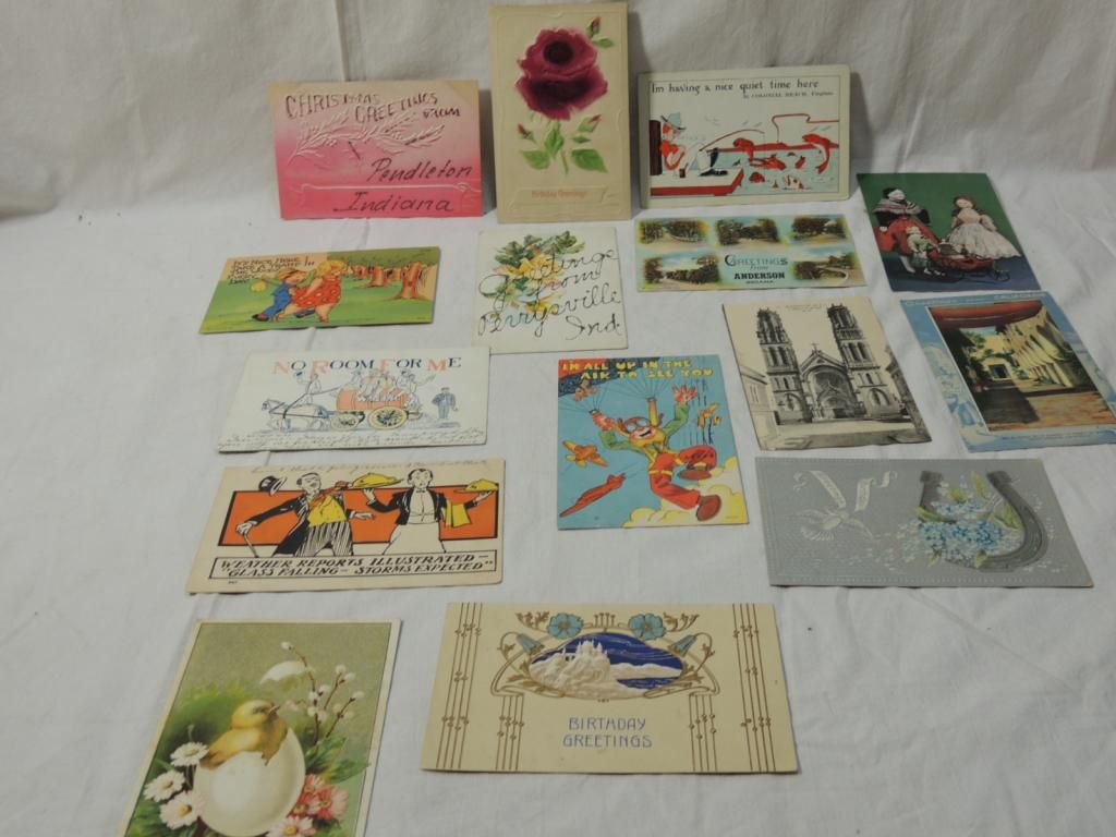 BOX LOT VINTAGE POSTCARDS. POST CARDS. HUMOR. HAND WRITTEN. COLOR, BLACK AND WHITE. EMBOSSED. HOLIDAY. HAPPY BIRTHDAY. SOME WITH STAMPS, SIMPATHY. PAPER EPHEMERA. AS SHOWN. SEE PHOTO FOR MORE DETAILS.