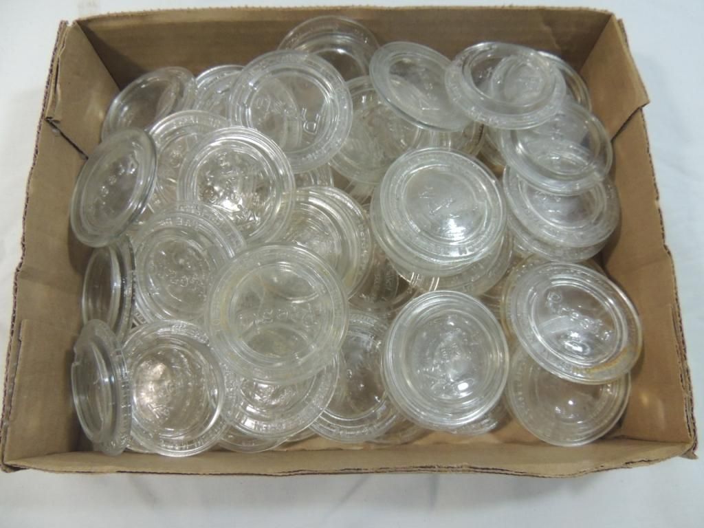 BOX LOT VINTAGE PRESTO LIDS GLASS LIDS CANNING JAR LIDS VINTAGE LIDS GLASS LIDS AS SHOWN SEE PHOTO FOR MORE DETAILS.