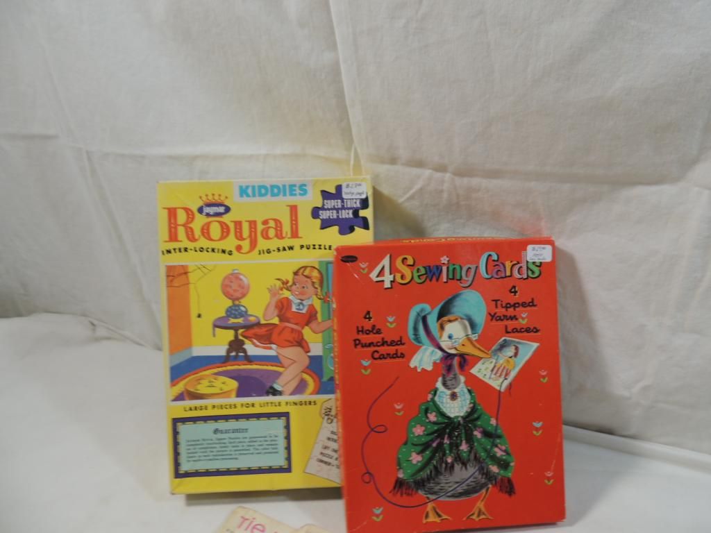 4 SEWING CARD SET IN ORGINAL BOX. GREAT CONDITION. LEARN TO SEW KIDS ACTIVITY KIDDIES ROYAL INTERLOCKING JIG SAW PUZZLE AS SHOWN SEE PHOTO FOR MORE DETIALS.