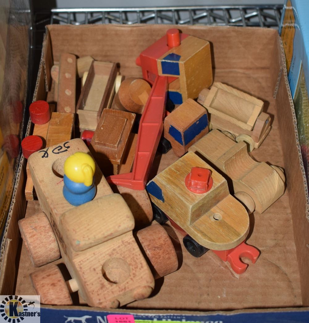 BOX LOT WITH VINTAGE WOODEN TOYS
