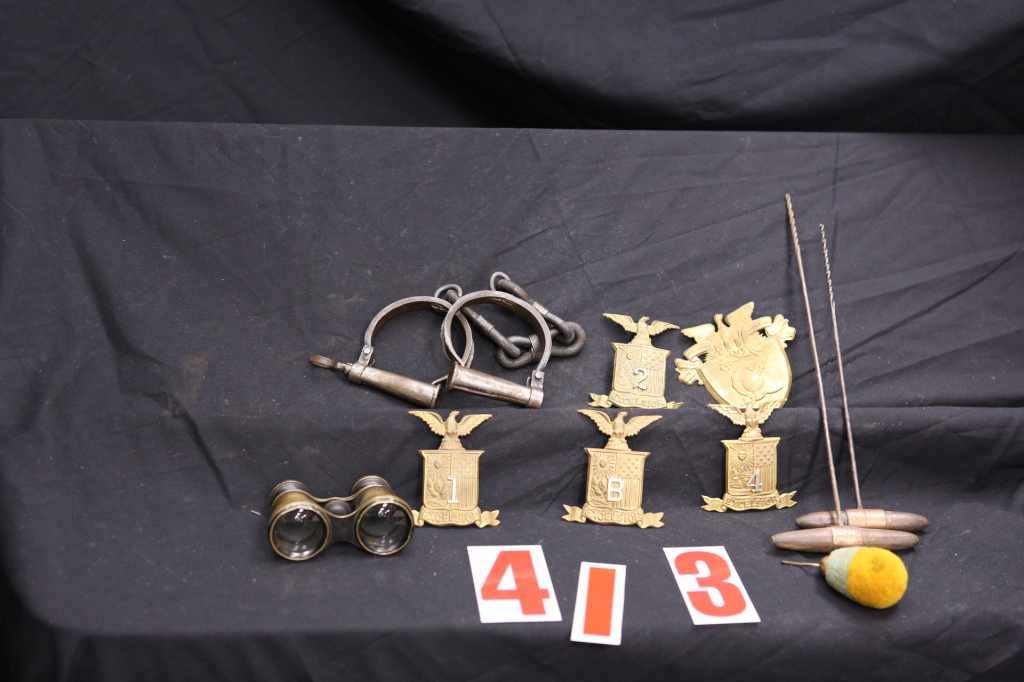 BOX LOT OF MISC OLD HANDCUFFS, 4 1880S HELMET PLATES, 1 WEST POINT PLATE, AND WEST POINT HELMET CAUCADE, OLD BINOCS, 2 OLD DRILSS(NON GUN)