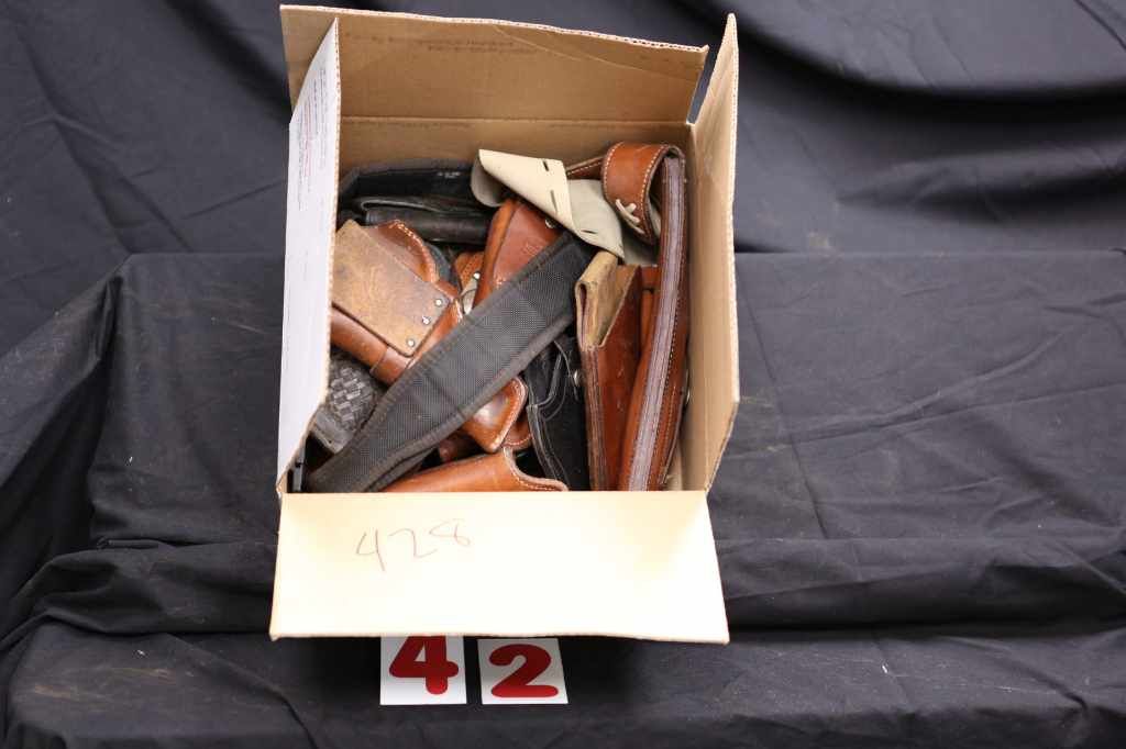 BOX LOT OF LEATHER HOLSTERS, LOTS OF THEM(NON GUN)