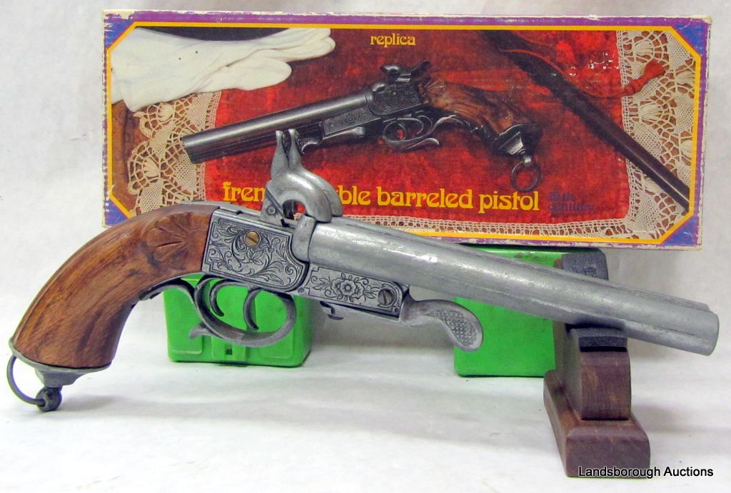 FRENCH DOUBLE BARRELED REPLICA PISTOL AND AMMO BOXES.