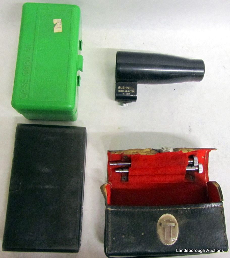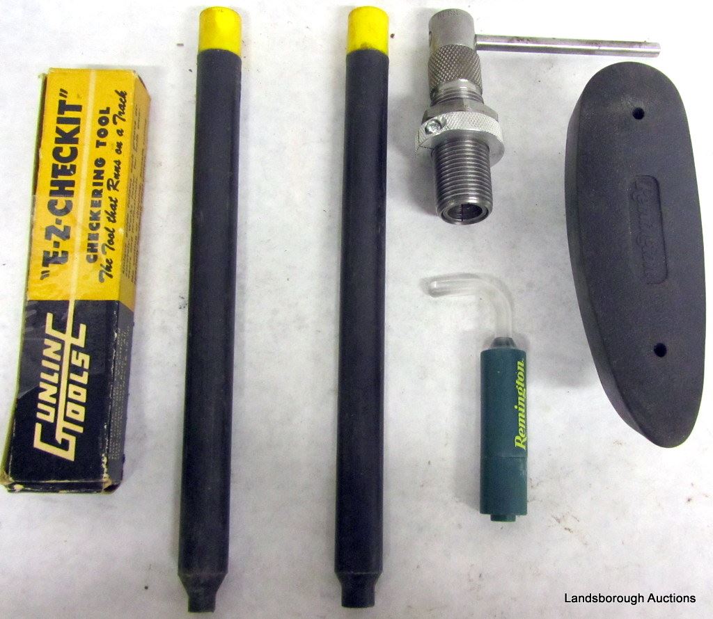 RCBS BULLET PULLER, CHECKERING TOOL, MTM BORE GUIDES, REM RECOIL PAD, 2 PLASTIC AMMO CARRIERS, BUSHNELL BORESIGHTER AND 2 ARBORS.