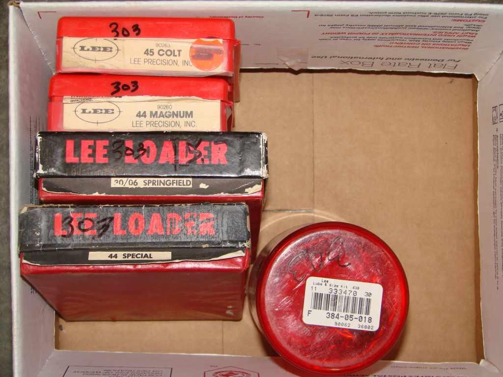 BOX LOT OF RELOADING DIES, LEE LOADERS, 30-06, 45 COLT, 44 MAG, 44 SPEC, (NON GUN)