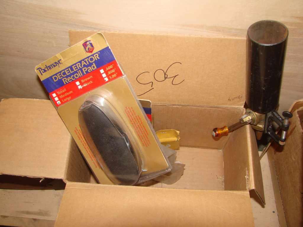 BOX LOT OF GUN MAGS, BUTT PADS, AND POWDER DROP (NON GUN)