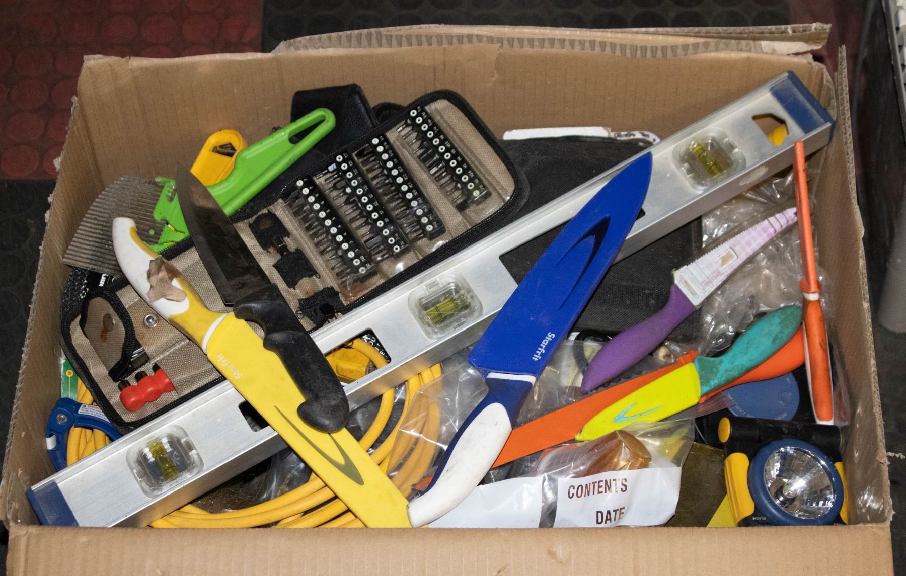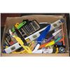 BOX MIXED TOOLS CHEF'S KNIVES BROOM, LEVEL ETC.