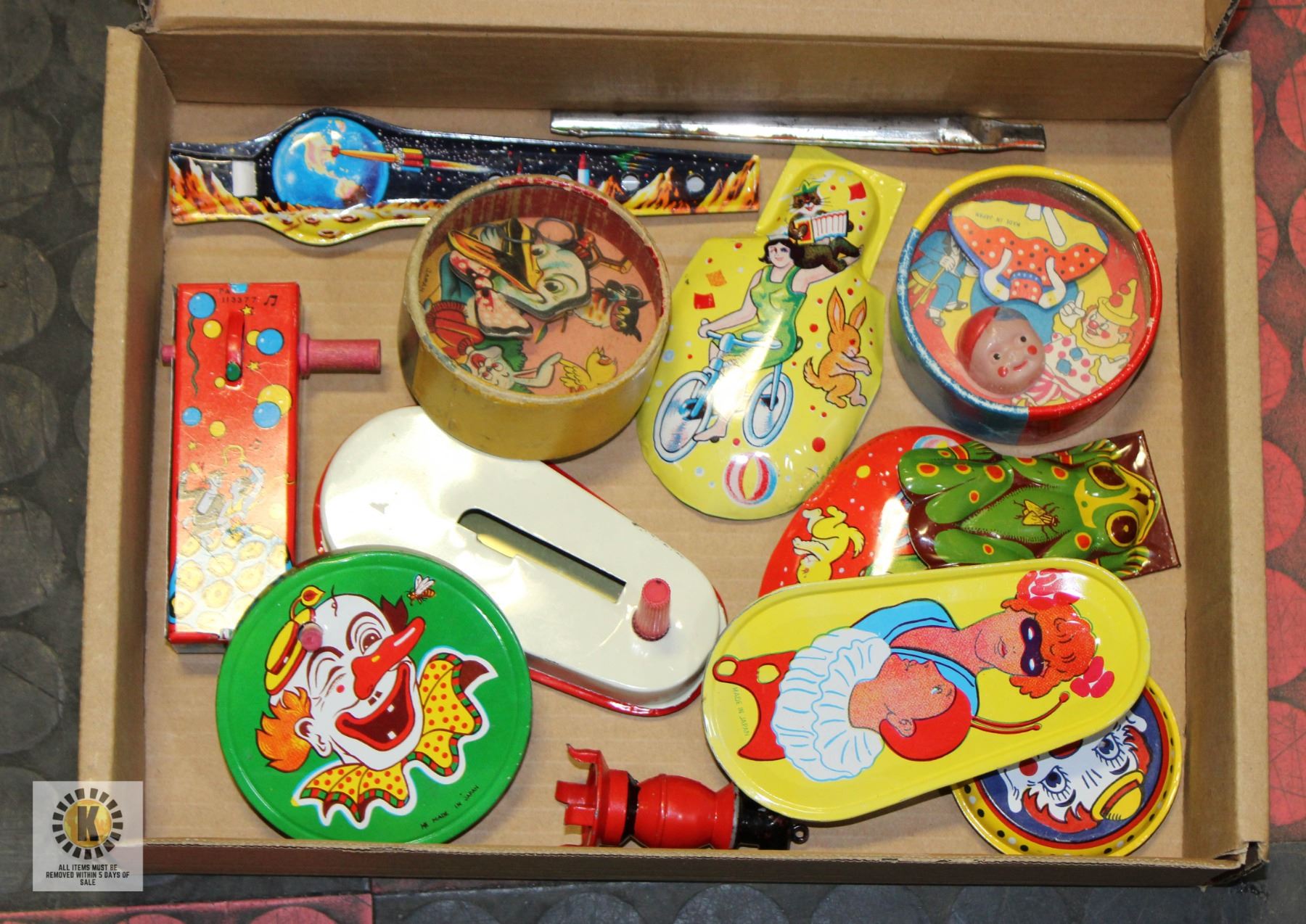 NOISE MAKERS (JAPAN)(3) TIN CLICKERS (JAPAN)(4) TIN WHISTLES (JAPAN)(1) CAST IRON MINI STOVE **ALL ITEMS MUST BE REMOVED BY 5PM SATURDAY, MARCH 15TH 2025. ALL REMAINING ITEMS WILL BE SUBJECT TO A $6.00 PER DAY STORAGE CHARGE. ANY ITEMS REMAINING AFTER MONDAY, MARCH 31ST 2025 WILL BE CONSIDERED FORFEITED. NO REFUNDS WILL BE ISSUED FOR FORFEITED ITEMS. TO SCHEDULE A PICK UP APPOINTMENT CLICK HERE