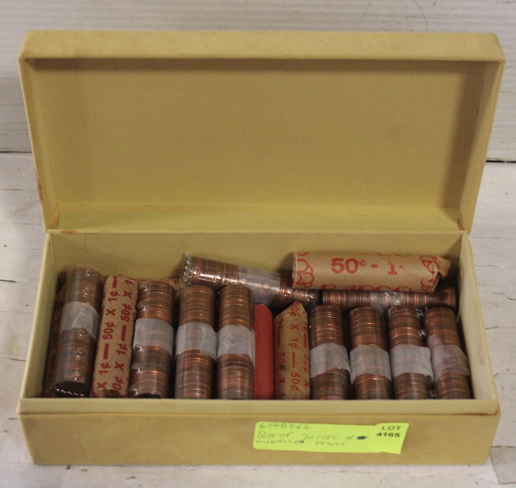 BOX OF 20 ROLLS OF UNSEARCHED PENNIES