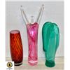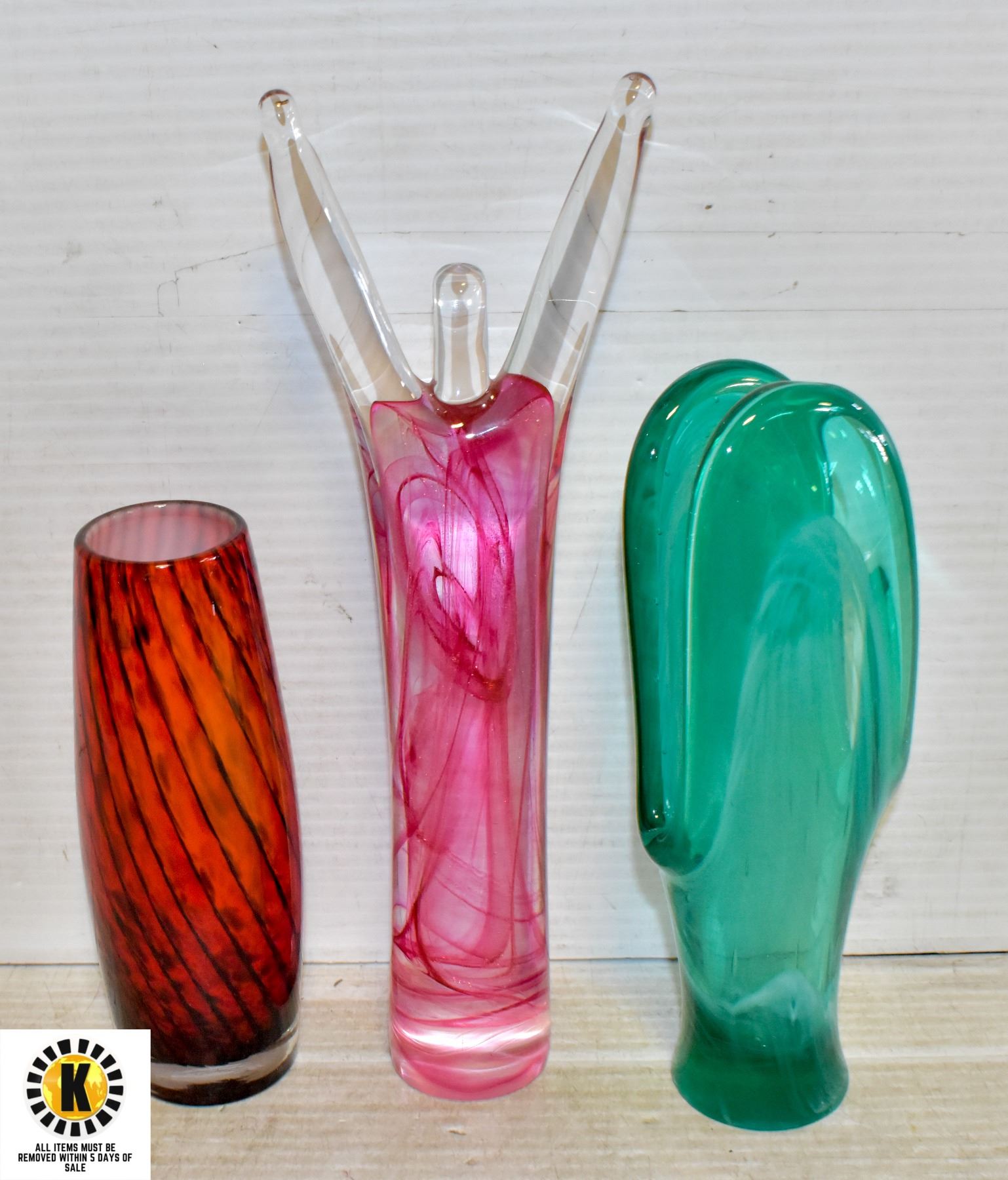 BOX OF 3 ART GLASS PIECES, ONE MAN STATUE, ONE RED