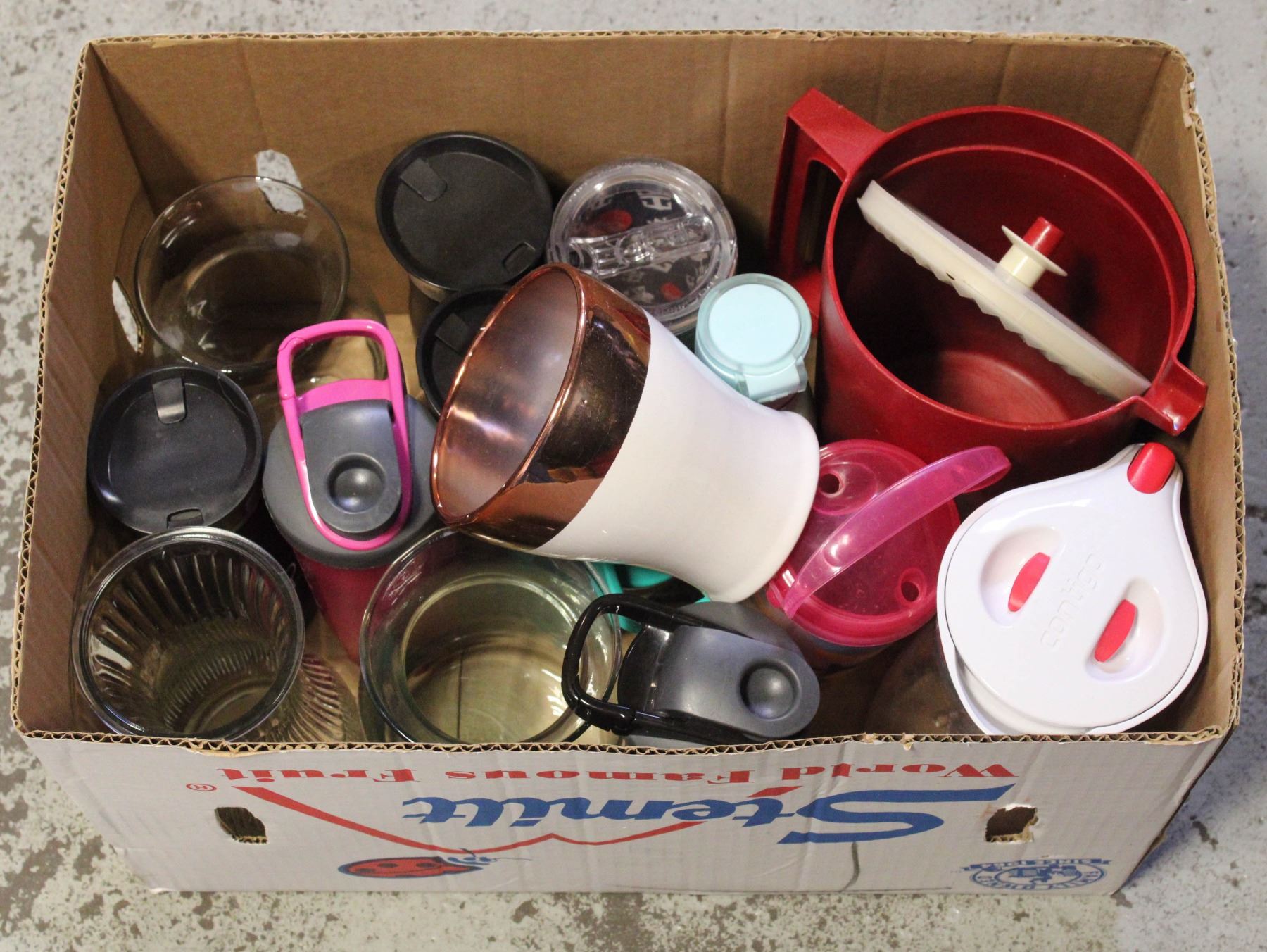 BOX OF 3- GLASS VASES; 2 JUICE JUGS & TRAVEL MUGS