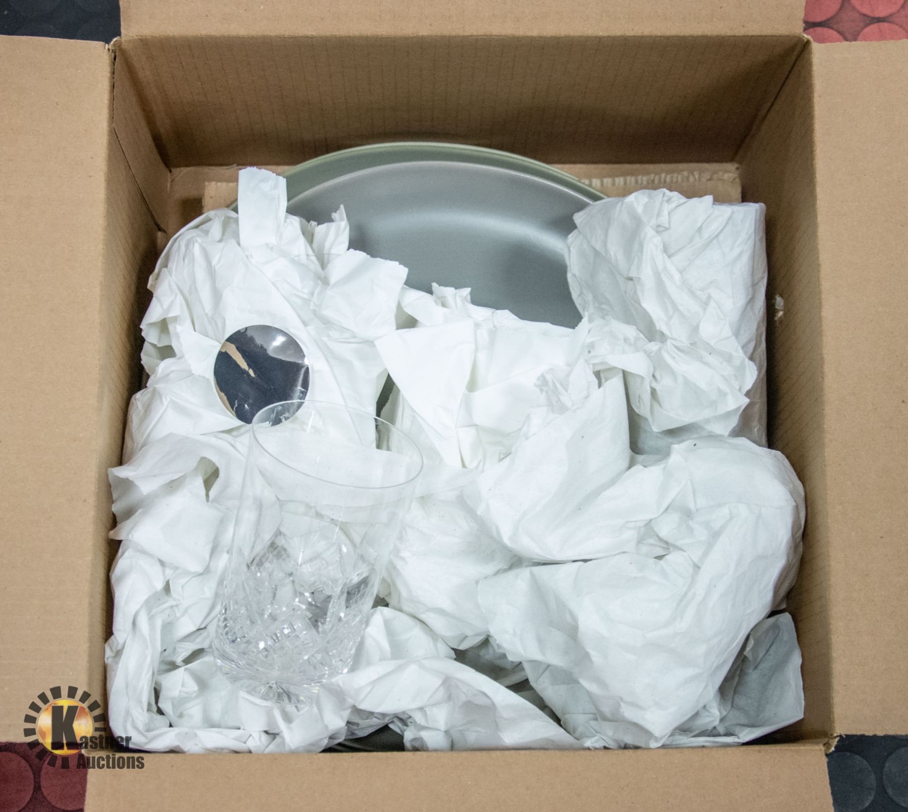 BARREL, 5 CRYSTAL GLASSES ROSCOE PLATES FROM CRATE AND BARREL WITH 5 MATCHING CRYSTAL GLASSES **ALL ITEMS MUST BE REMOVED BY 5PM SATURDAY, NOVEMBER 25TH 2023. ALL REMAINING ITEMS WILL BE SUBJECT TO A $6.00 PER DAY STORAGE CHARGE. ANY ITEMS REMAINING AFTER MONDAY, DECEMBER 11TH, 2023 WILL BE CONSIDERED FORFEITED. NO REFUNDS WILL BE ISSUED FOR FORFEITED ITEMS. TO SCHEDULE A PICK UP APPOINTMENT CLICK HERE