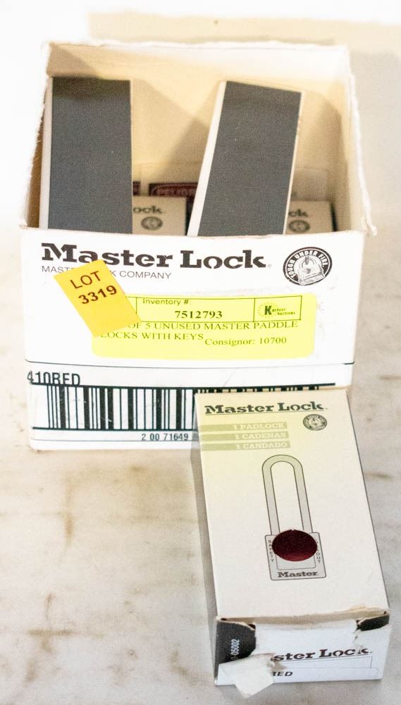 BOX OF 5 UNUSED MASTER PADDLE LOCKS WITH KEYS