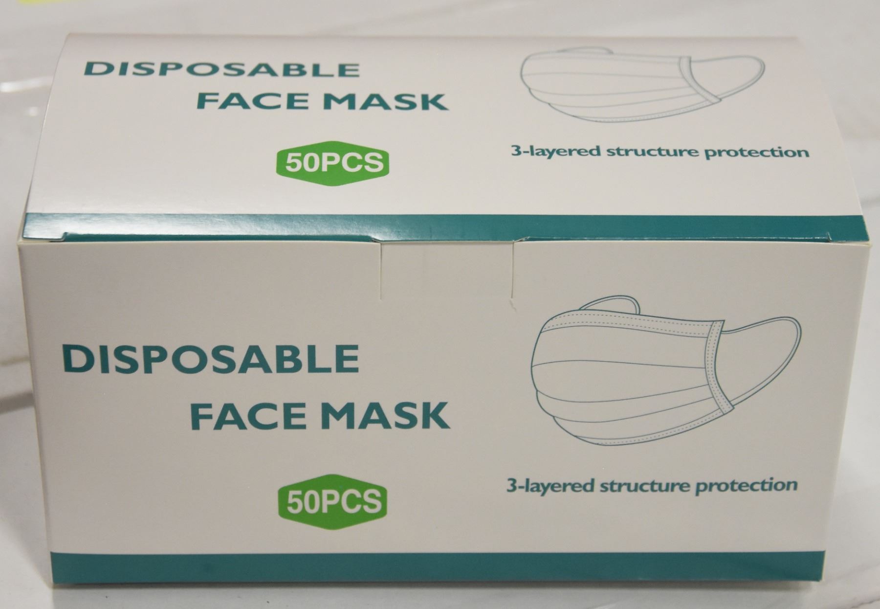 BOX OF 50 DISPOSABLE FACE MASKS.