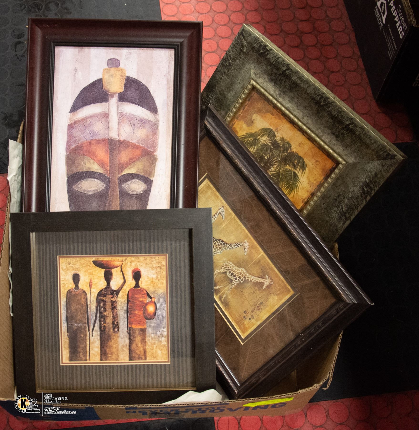 WOOD FRAMED COLOURFUL FACE MASK, MICHEL RAUSCHER "TO THE GATHERING" FRAMED PRINT, ELAINE VOLLHERBST "GIRAFFE" FRAMED PRINT, ETC.