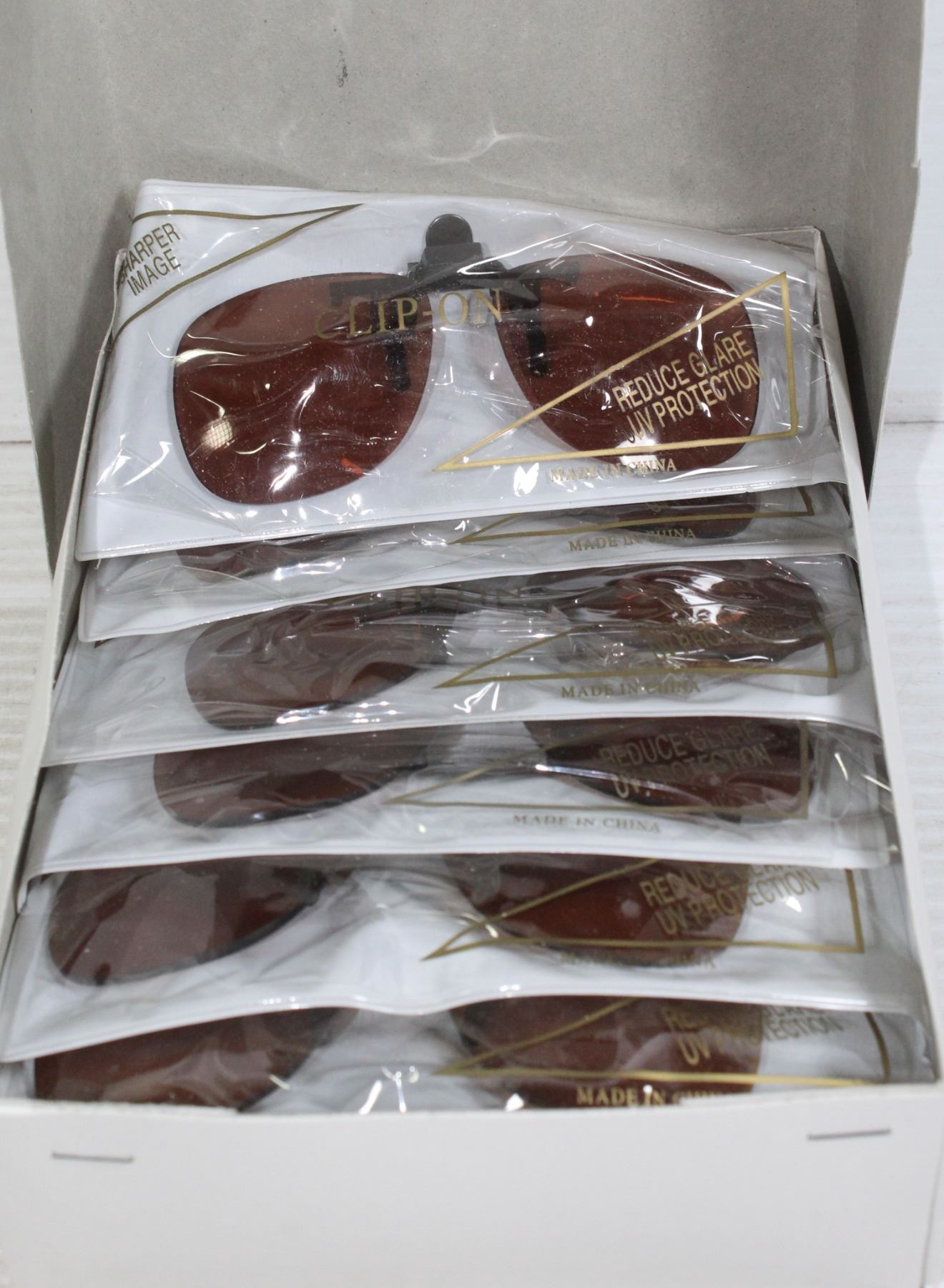 BOX OF AMBER COLOR CLIP-ON SUNGLASSES.