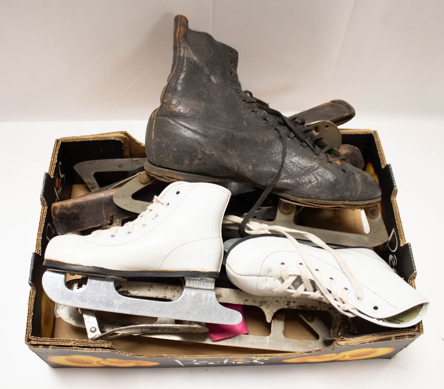 BOX OF ANTIQUE HOCKEY SKATES ASSTD