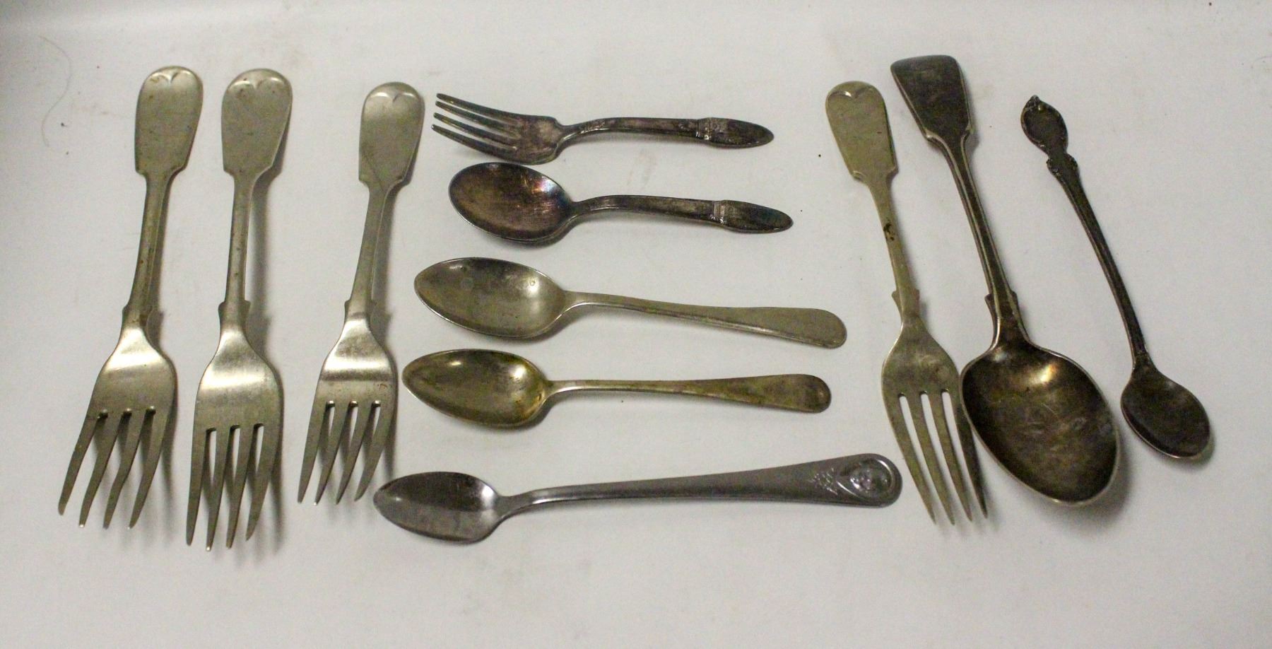 BOX OF ANTIQUE SILVER FORKS ETC