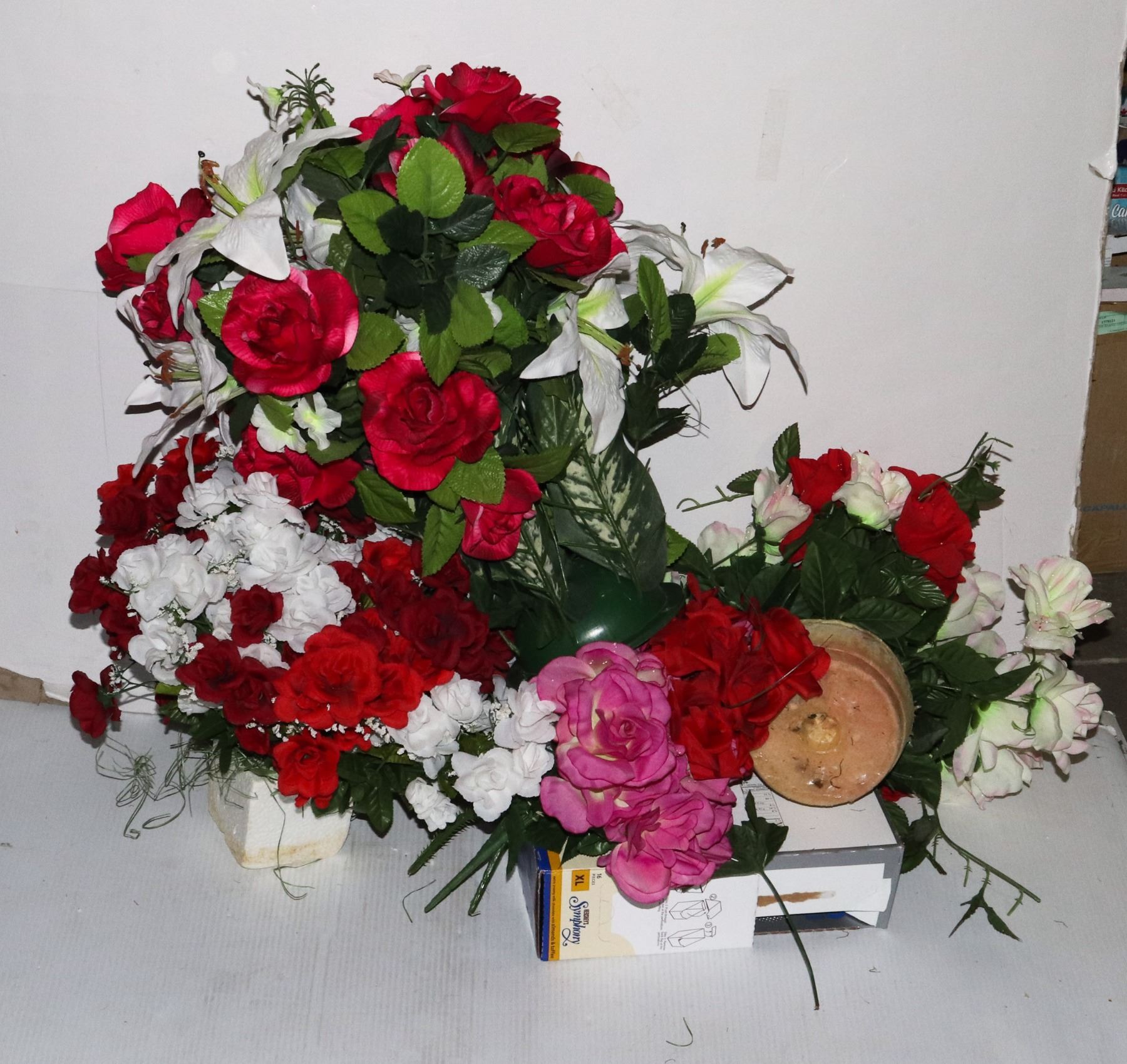 BOX OF ARTIFICIAL FLOWERS IN VASES