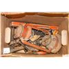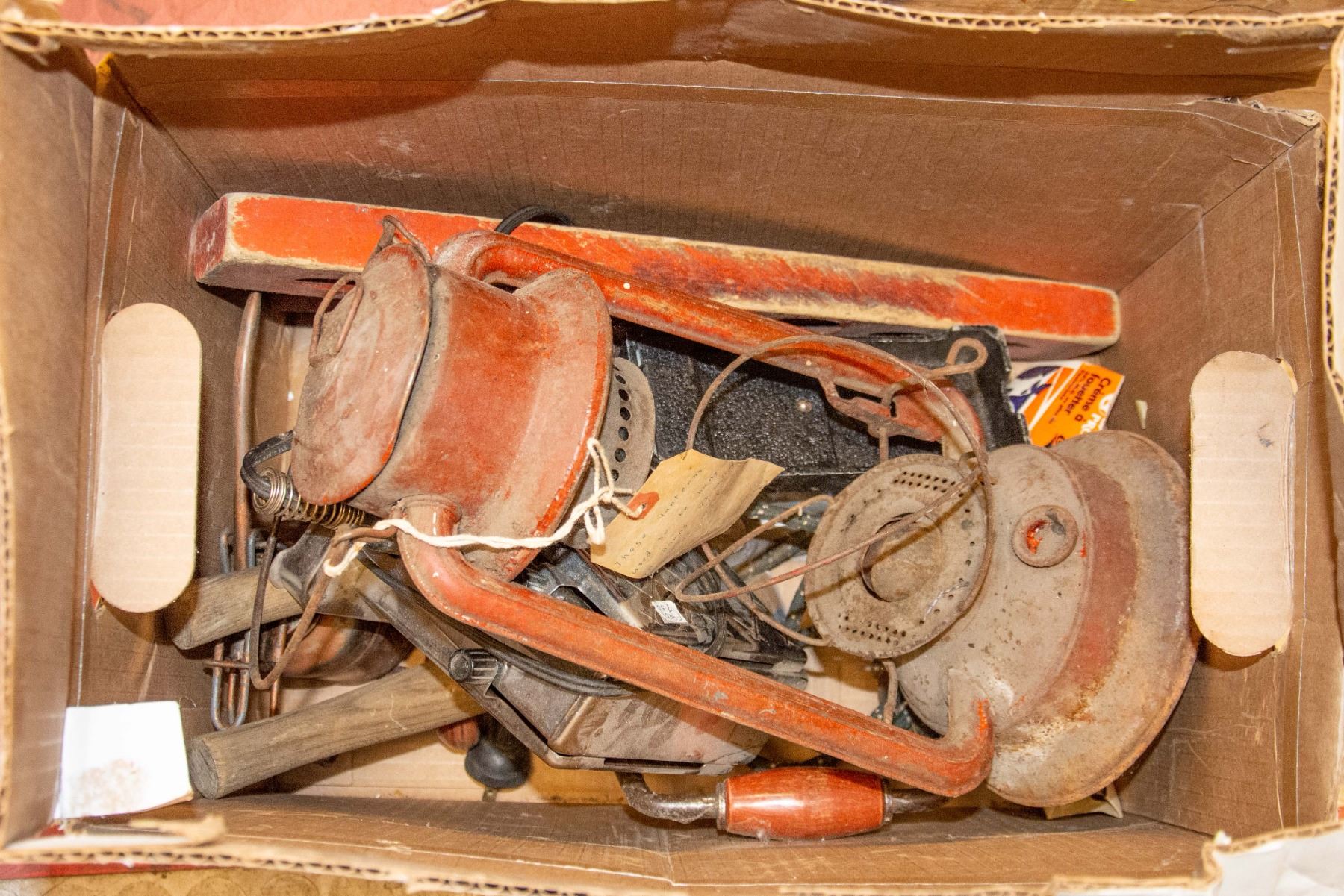 BOX OF ASSORTED ANTIQUE TOOLS AND MORE