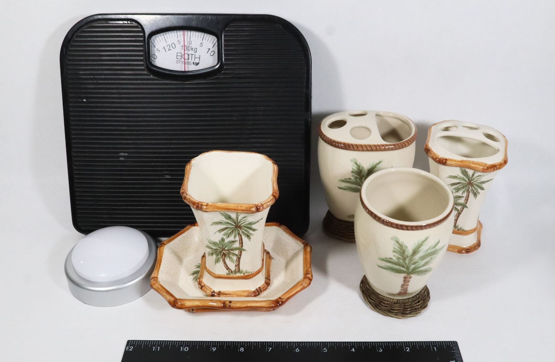BATHROOM SCALE, BATTERY POWERED UNDERCOUNTER LIGHT, SOAP HOLDER AND OTHER CERAMIC PIECES (CHIP TO ONE)
