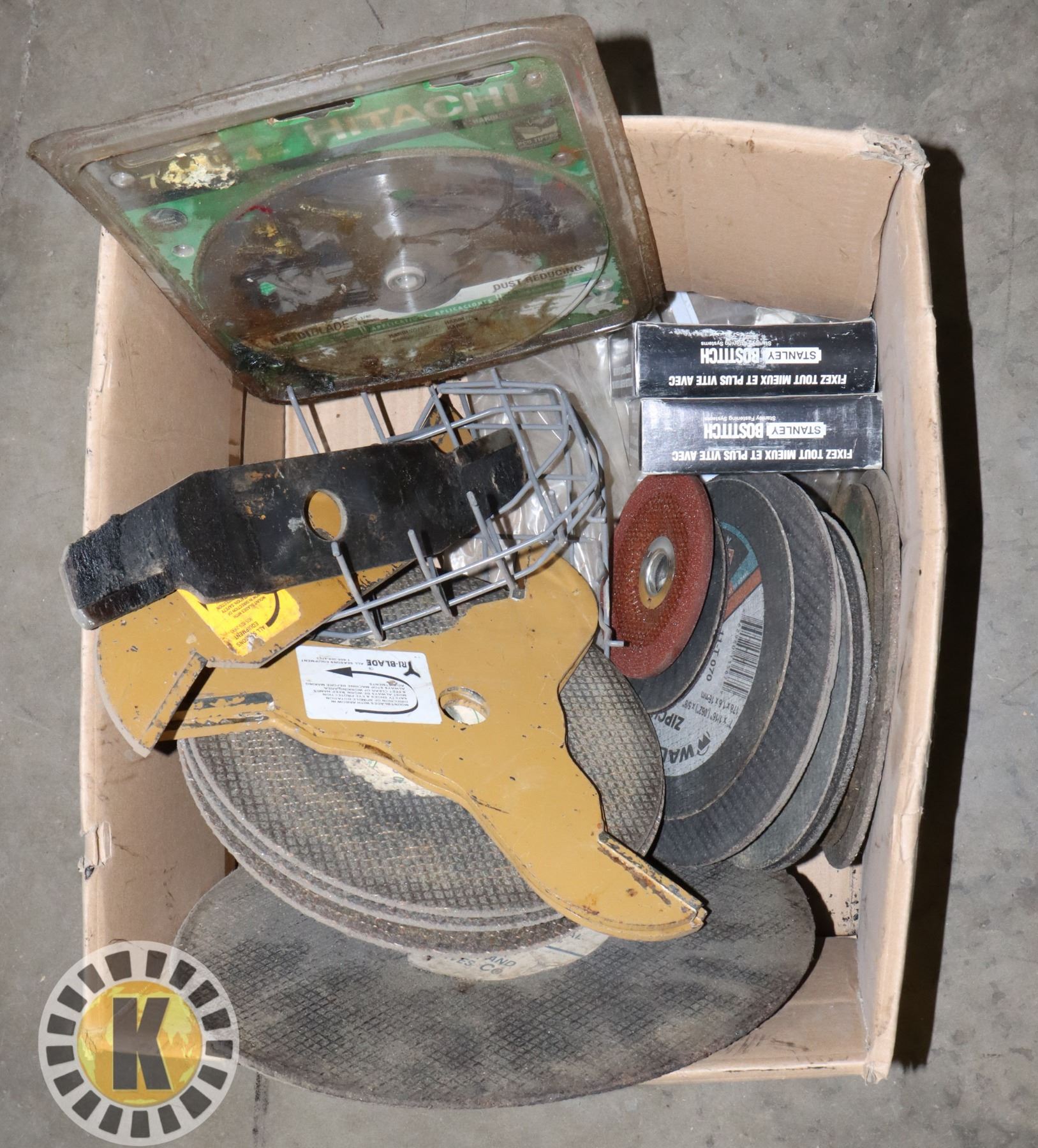 BOX OF ASSORTED BLADES, DISCS, STAPLES AND MORE