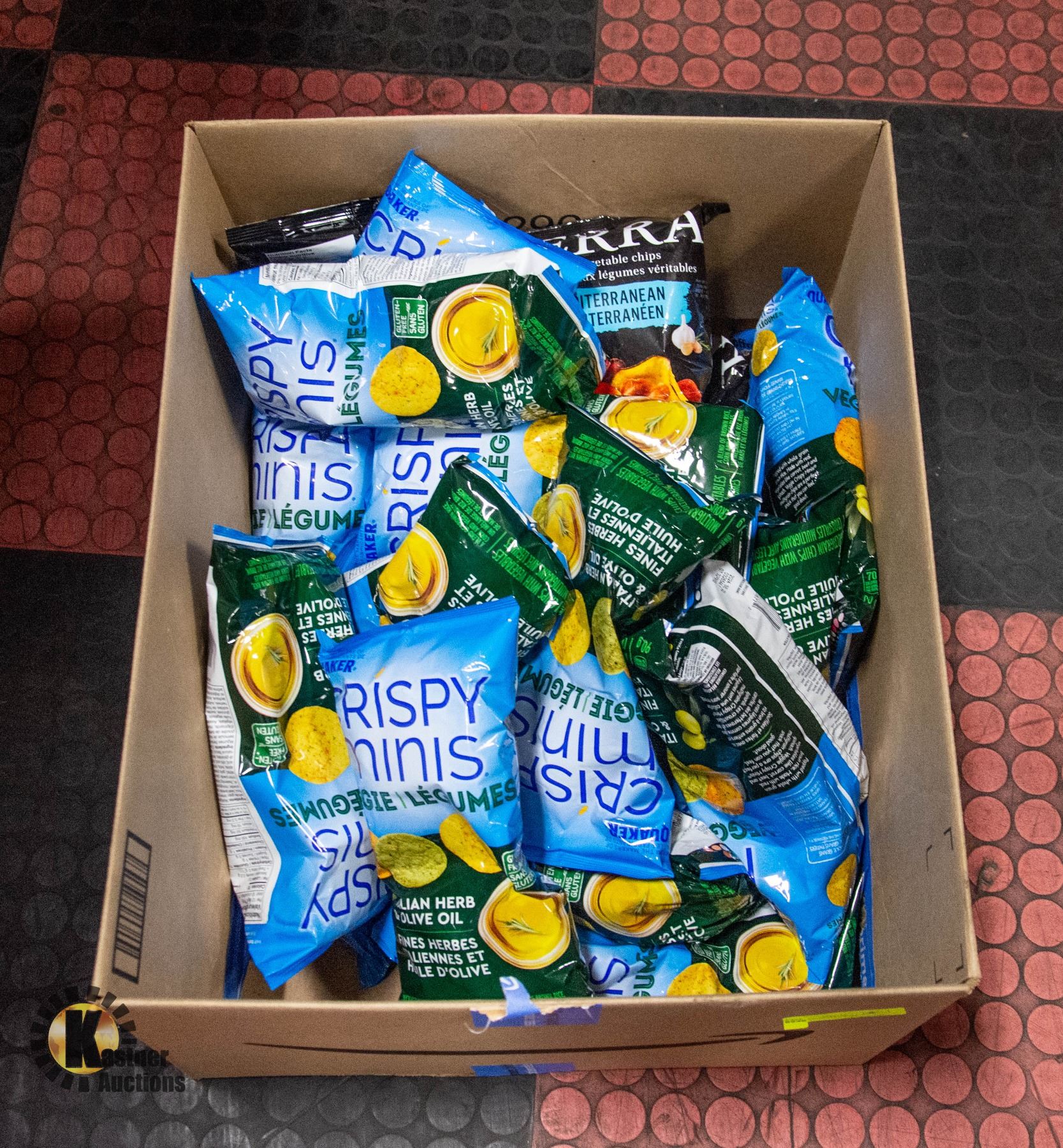 15- 90G CRISPY MINI VEGGIES, 5-141G TERRA REAL VEGI CHIPS MEDITERRANEAN, 1-212G POP DADDY GARLIC PRTZELS, 1- 198G JALAPENO CHEEZ PUFFS, AMZ SES