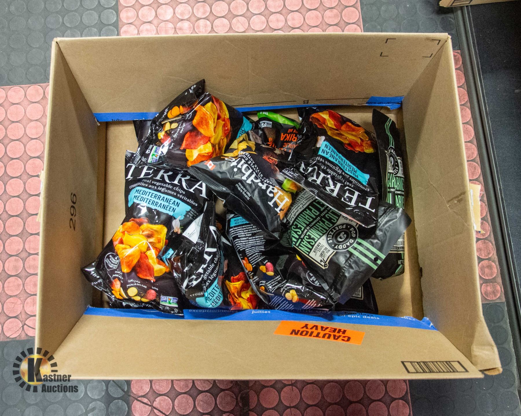 7 X 141G TERRA MEDITERRANEAN, 3 X 212G POP DADDY GARLIC PARMESAN PRETZAL STICKS, 1 X 128G HARDBITE SMOKED PAPRIKA AND GARLIC, AMZ SES VARIOUS BEST BEFORE DATES **ALL ITEMS MUST BE REMOVED BY 5PM SATURDAY, OCTOBER 19TH 2024. ALL REMAINING ITEMS WILL BE SUBJECT TO A $6.00 PER DAY STORAGE CHARGE. ANY ITEMS REMAINING AFTER MONDAY, NOVEMBER 4TH 2024 WILL BE CONSIDERED FORFEITED. NO REFUNDS WILL BE ISSUED FOR FORFEITED ITEMS. TO SCHEDULE A PICK UP APPOINTMENT CLICK HERE