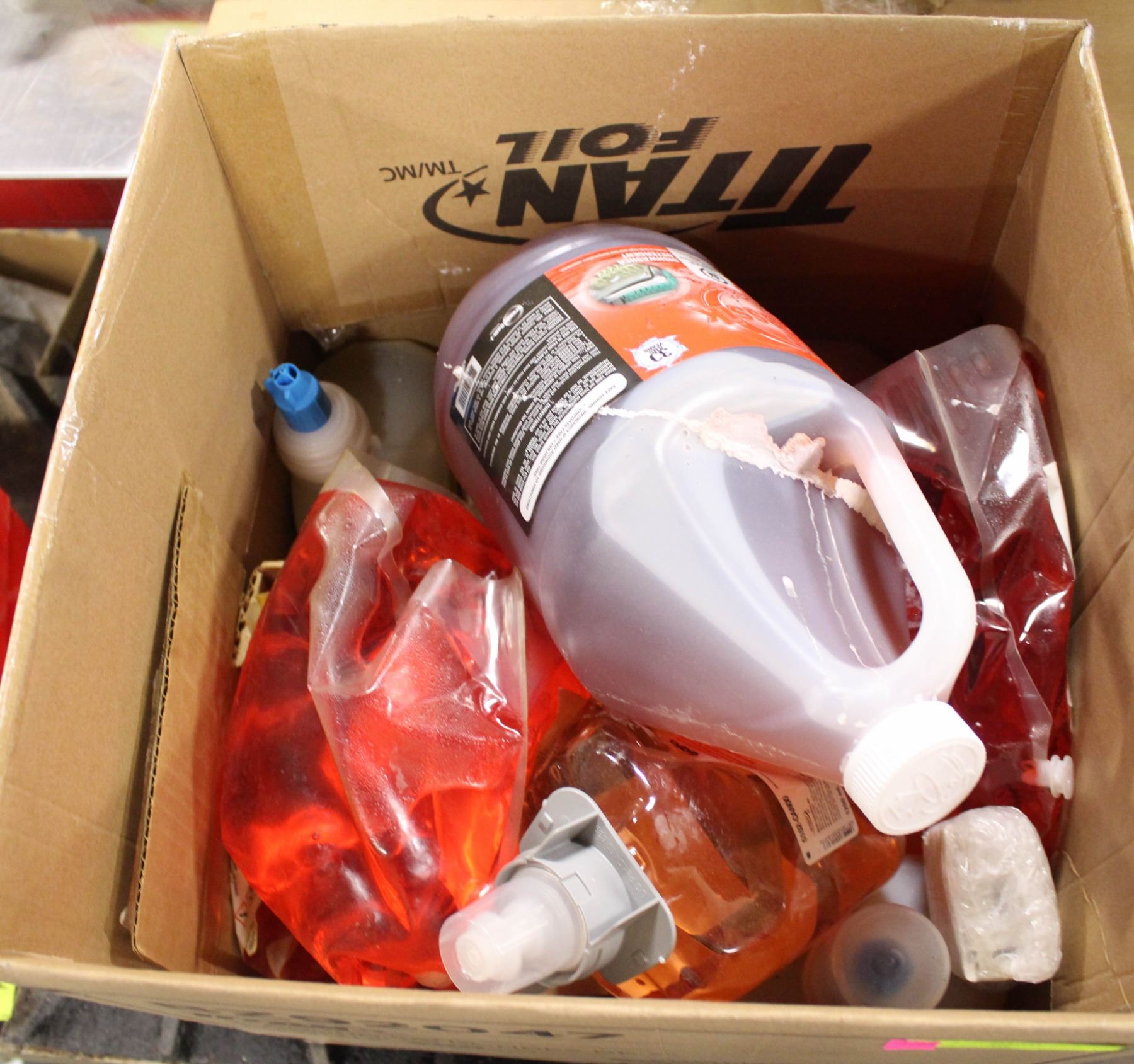 BOX OF ASSORTED CLEANING SOAPS/SANITIZER
