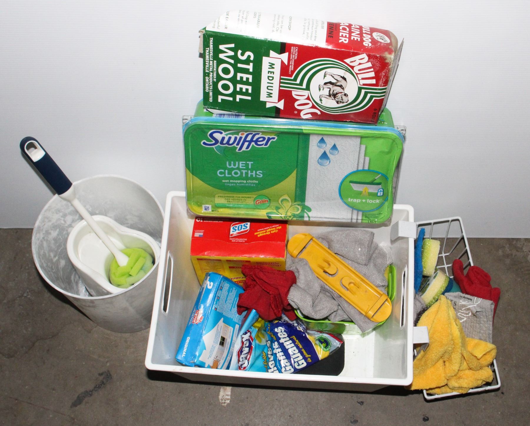 SOME USED. INCLUDING STEEL WOOL, SWIFFER WET CLOTHES, AND MORE