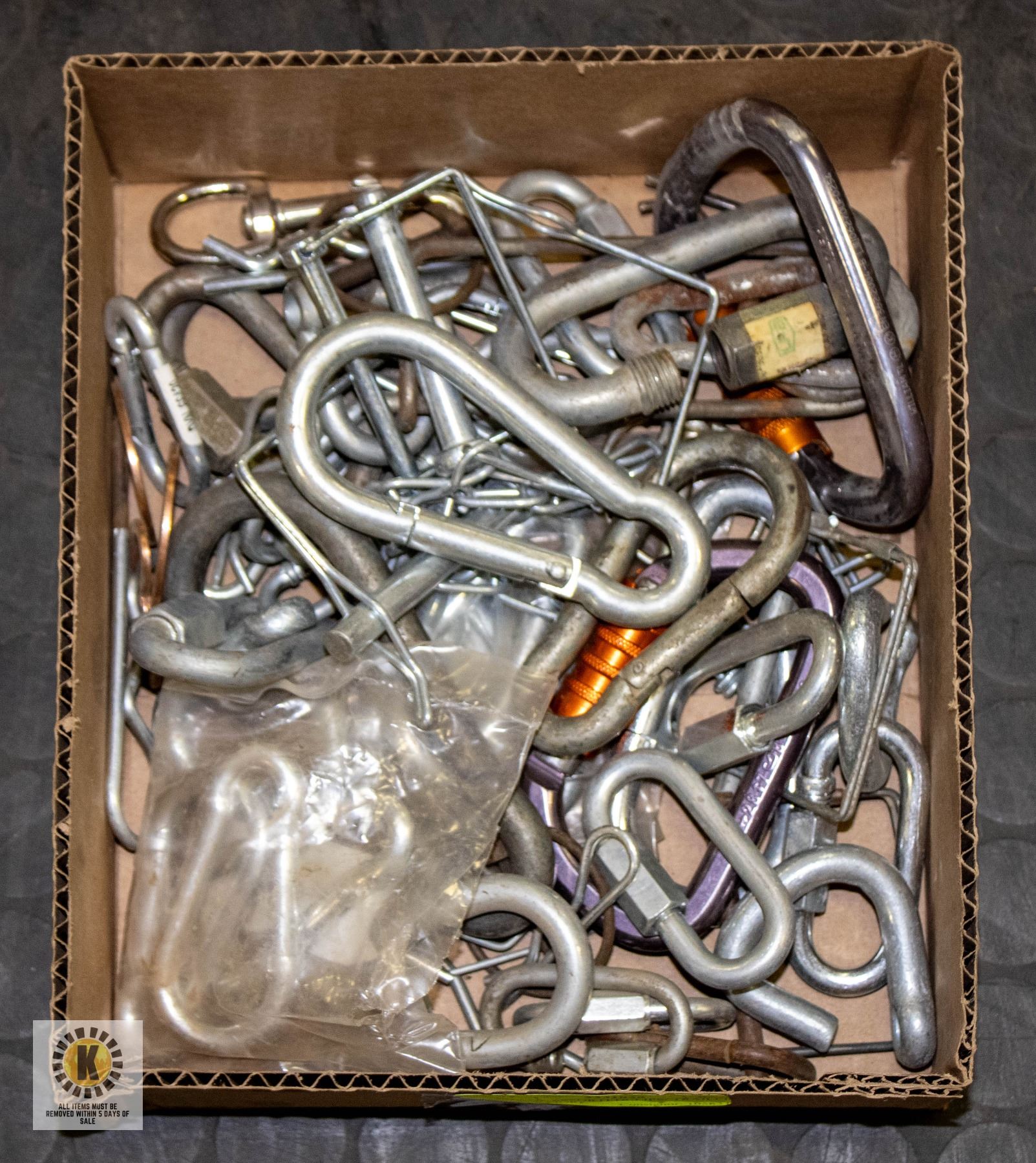 BOX OF ASSORTED CLIPS/TRAILER PINS & MORE