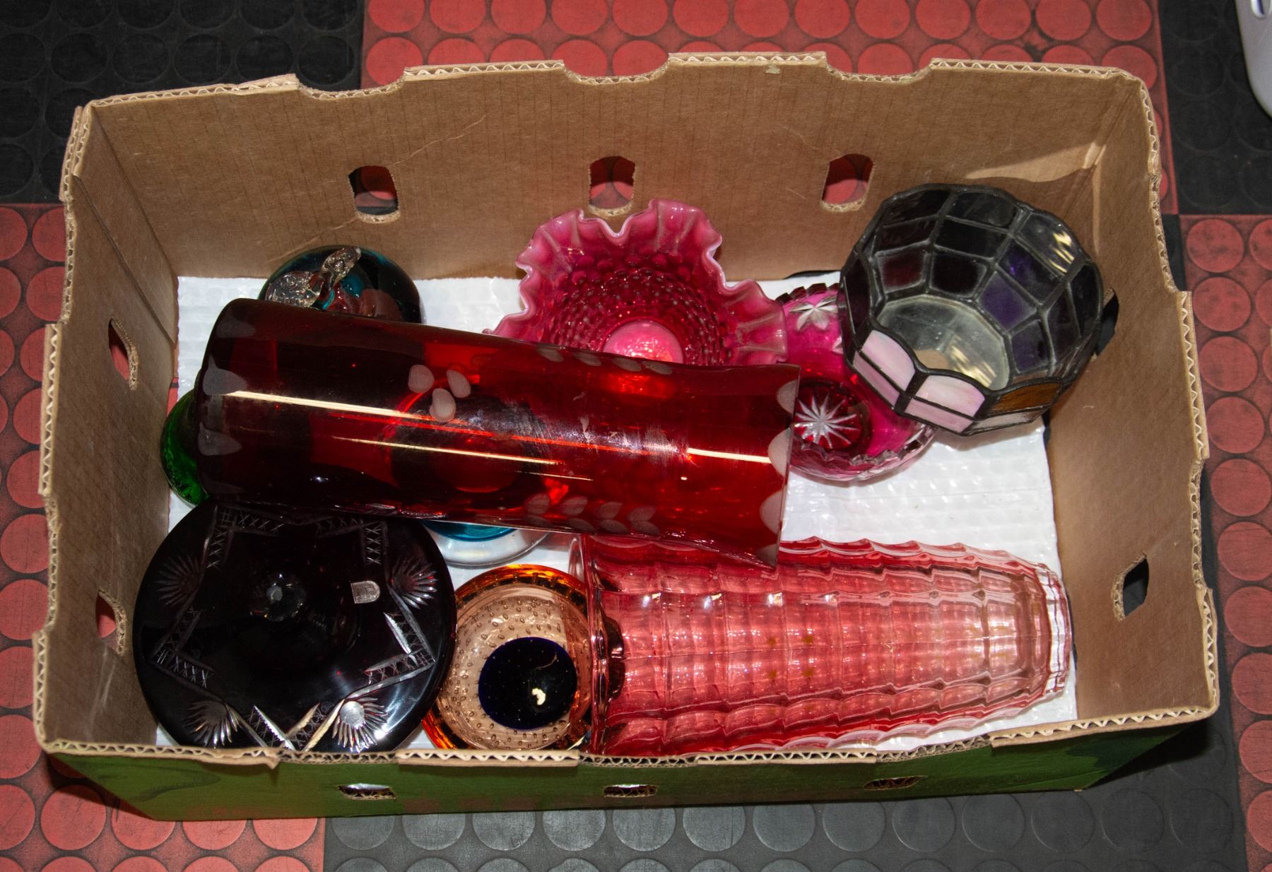 BOX OF ASSORTED COLORED GLASS/CRYSTAL DECOR