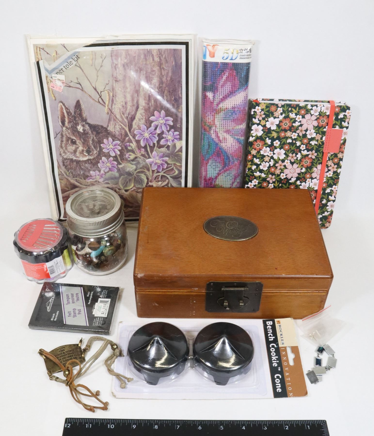 SEWING KIT, DIAMOND ART KIT, JEWELRY FOR PARTS IN ANTIQUE JAR, AND MORE