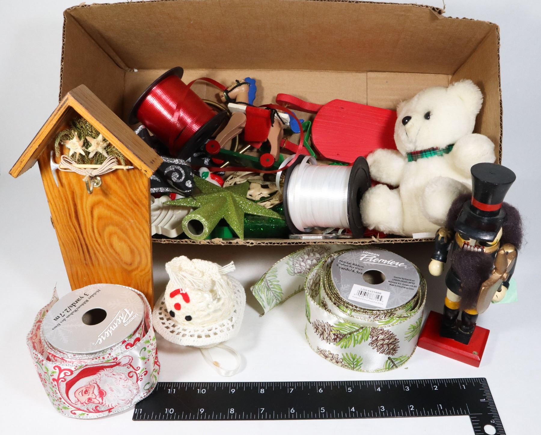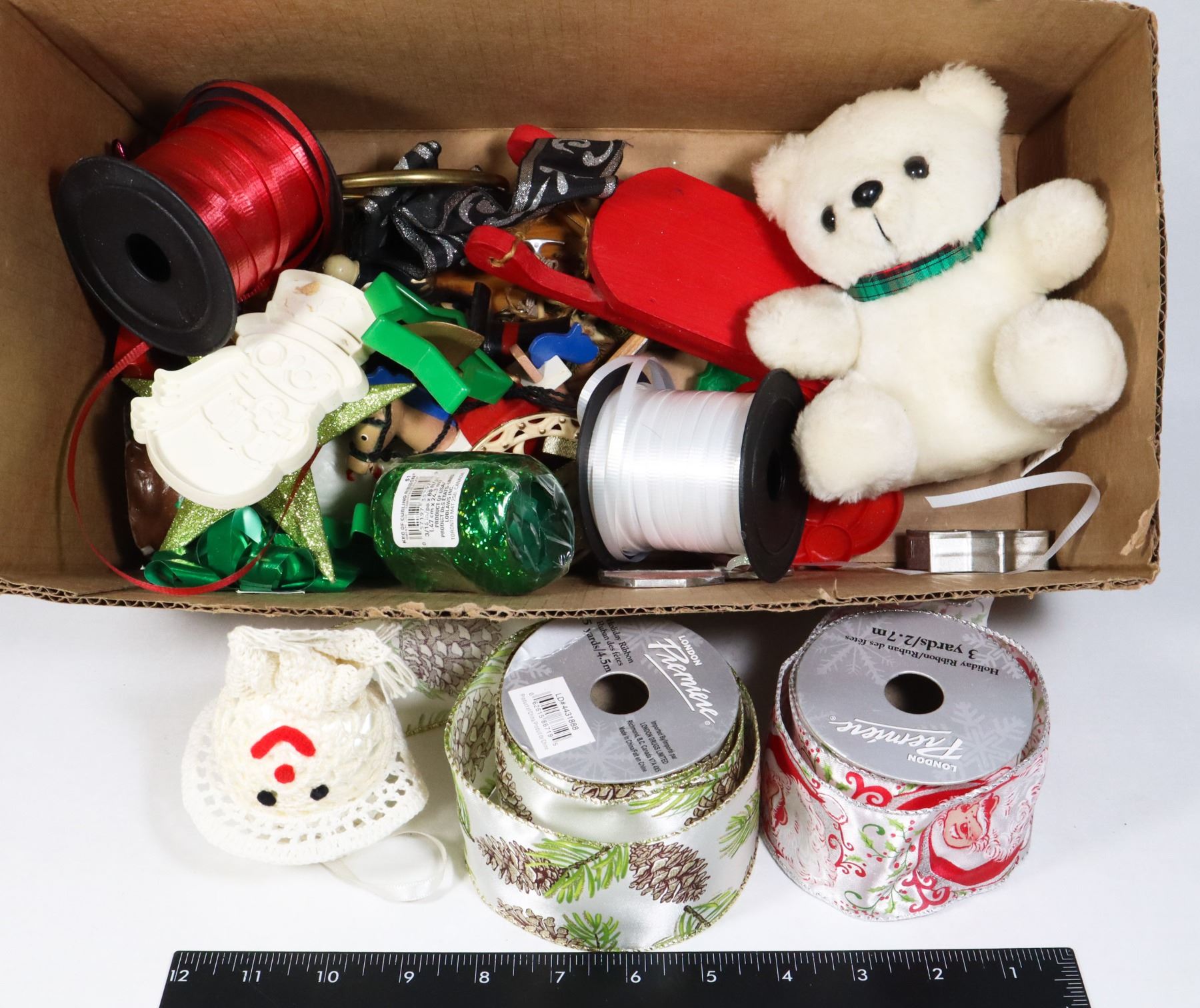 BOX OF ASSORTED CRAFTING SUPPLIES, RIBBON, ECT