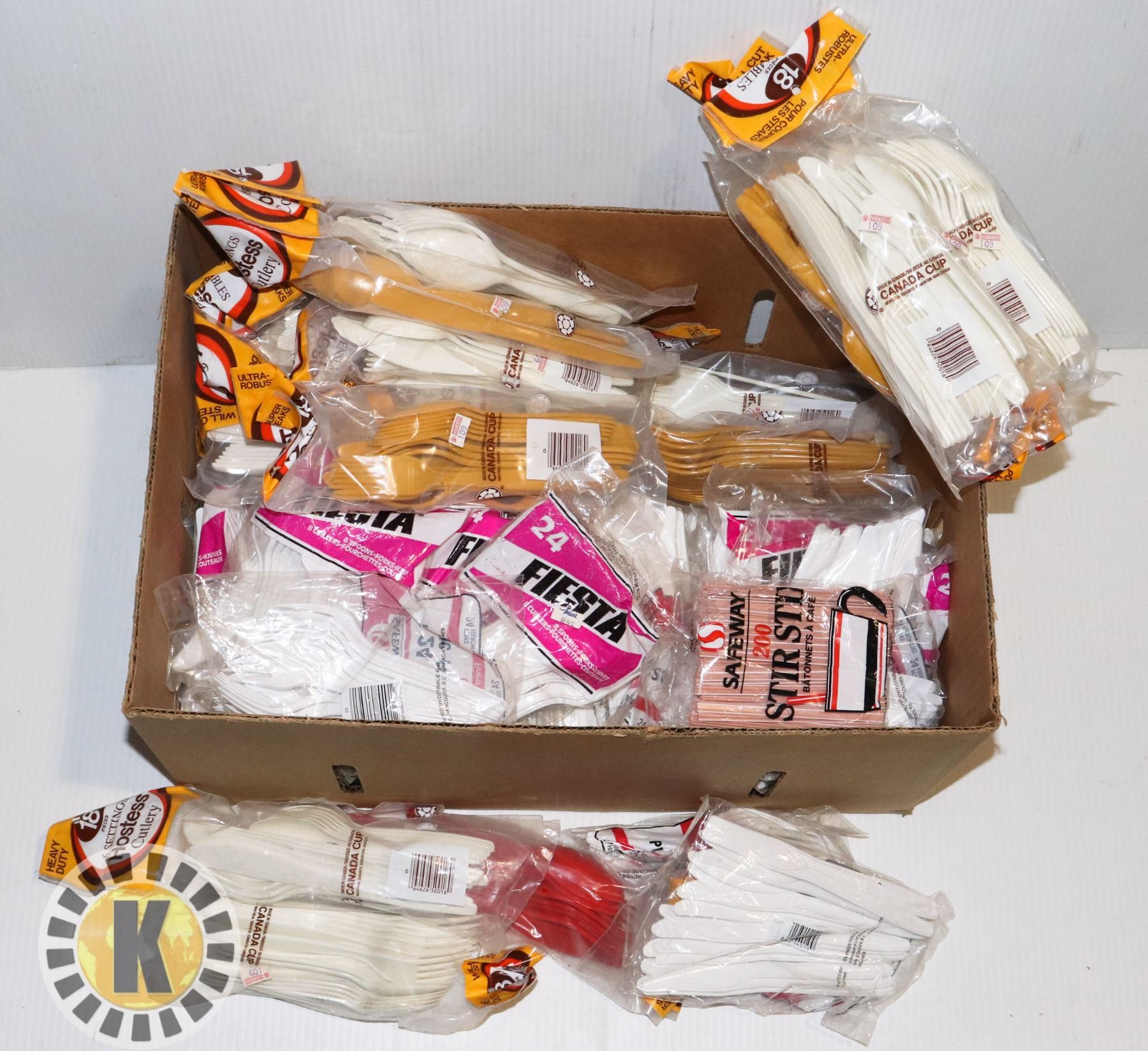 BOX OF ASSORTED DISPOSABLE PLASTIC UTENSILS