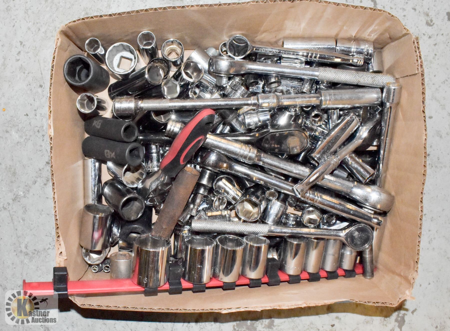 BOX OF ASSORTED DRIVERS & SOCKETS