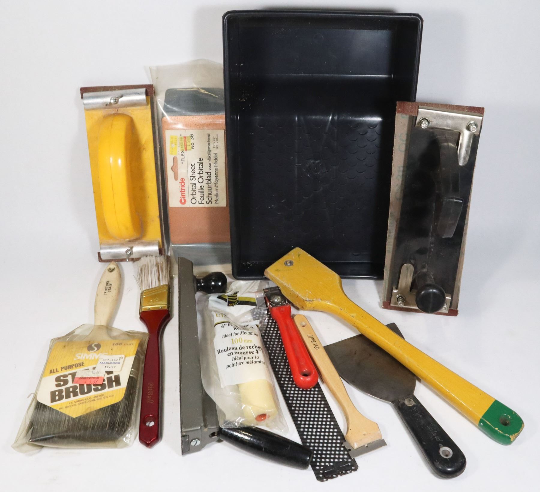 BOX OF ASSORTED DRYWALL AND PAINTING TOOLS