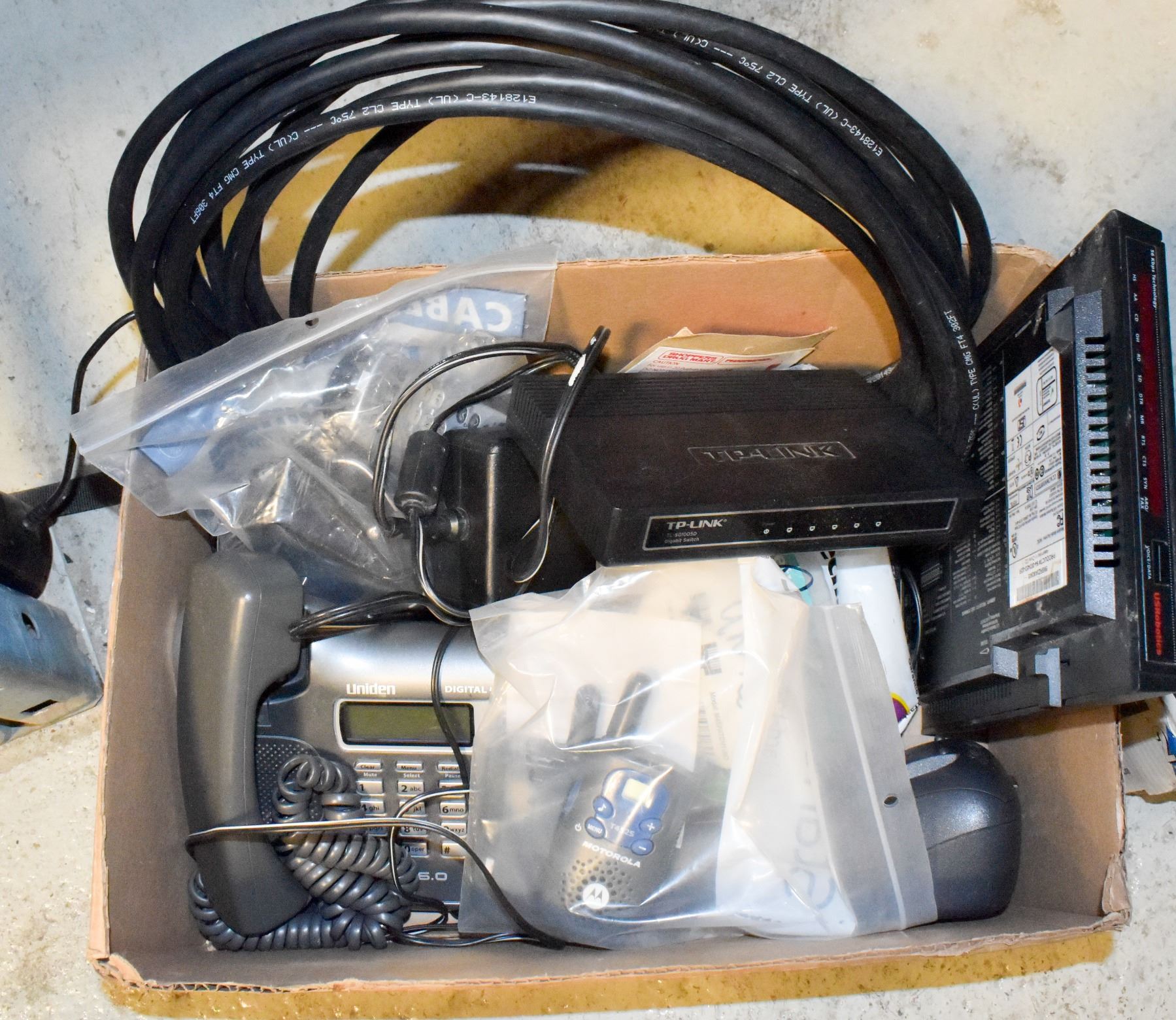 UNIDEN PHONE + REMOTE STATION USROBOTICS 345C MODEM TP-LINK GIGABIT SWITCH TL-SG1005D, 30 FOOT VGA CABLE + MORE