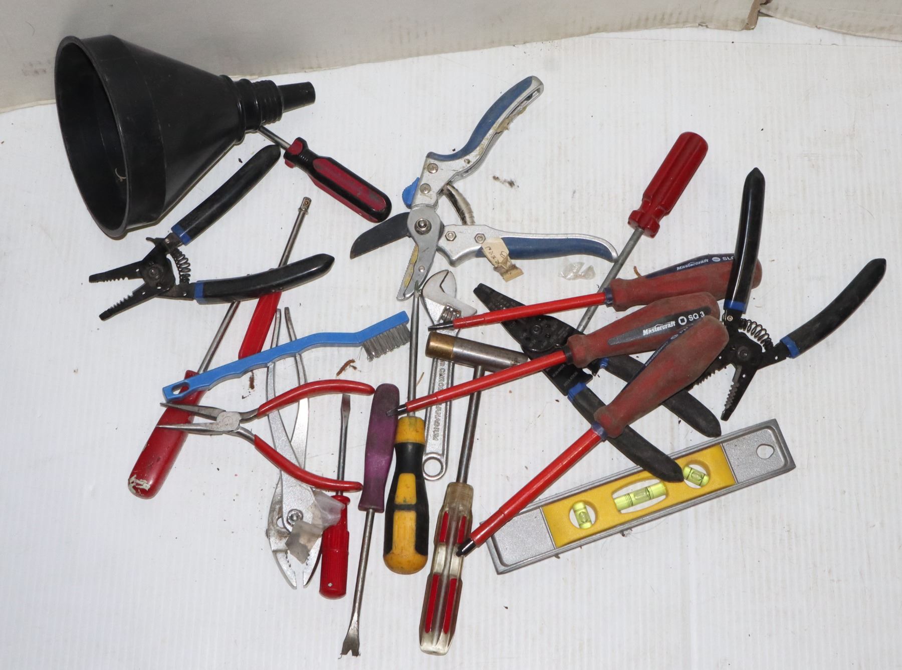 FUNNEL, WIRE STRIPPERS, SMALL LEVEL, AND MORE