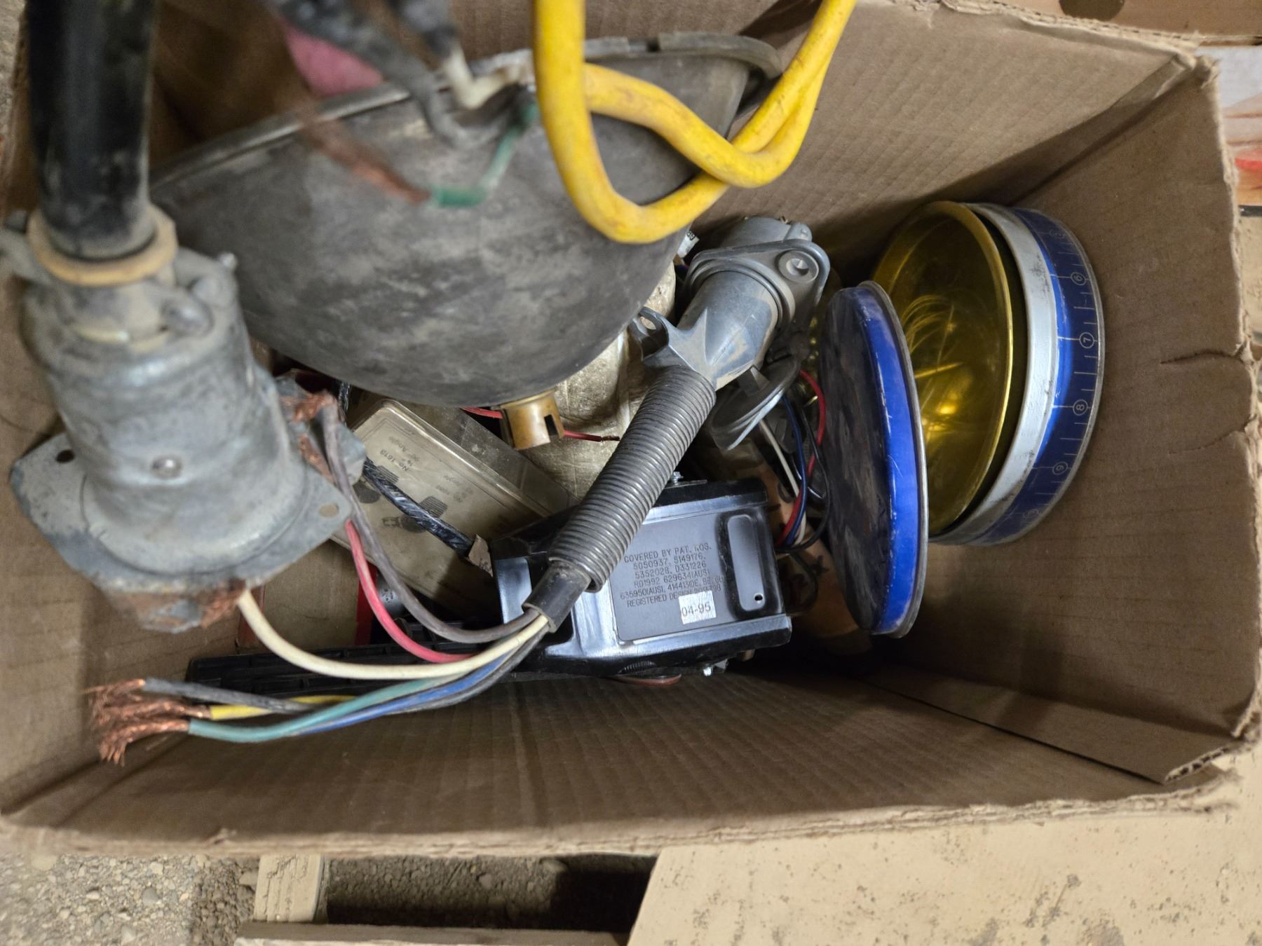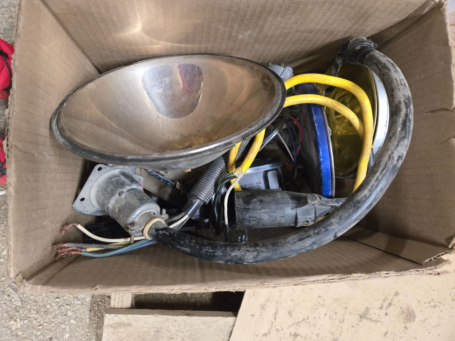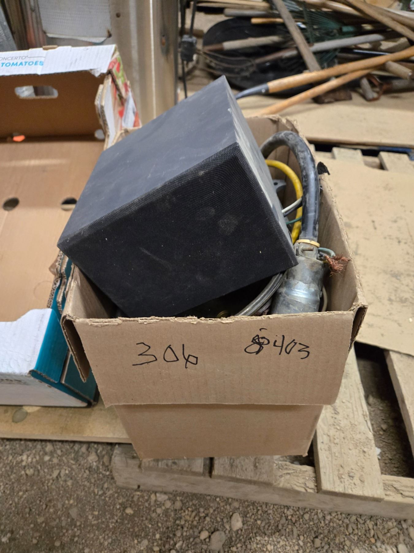 BOX OF ASSORTED HARDWARE, ELECTRONICS, TRAILER PLUGS.