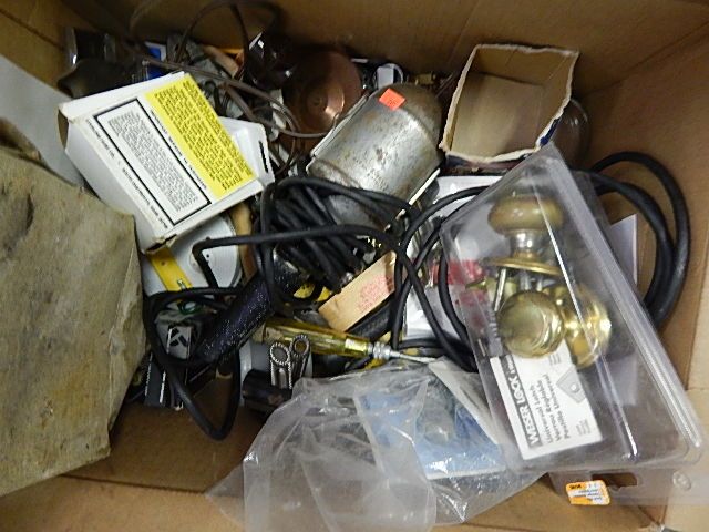 BOX OF ASSORTED HARDWARE, TOOLS ETC
