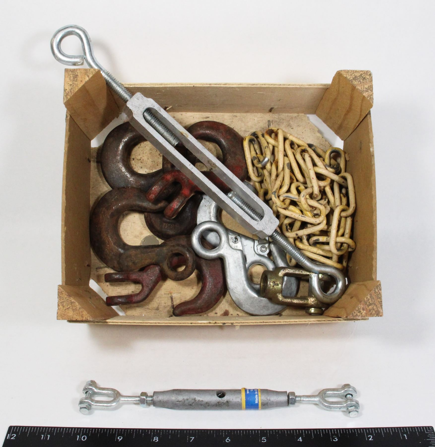 BOX OF ASSORTED HOOKS, CHAIN, AND MORE