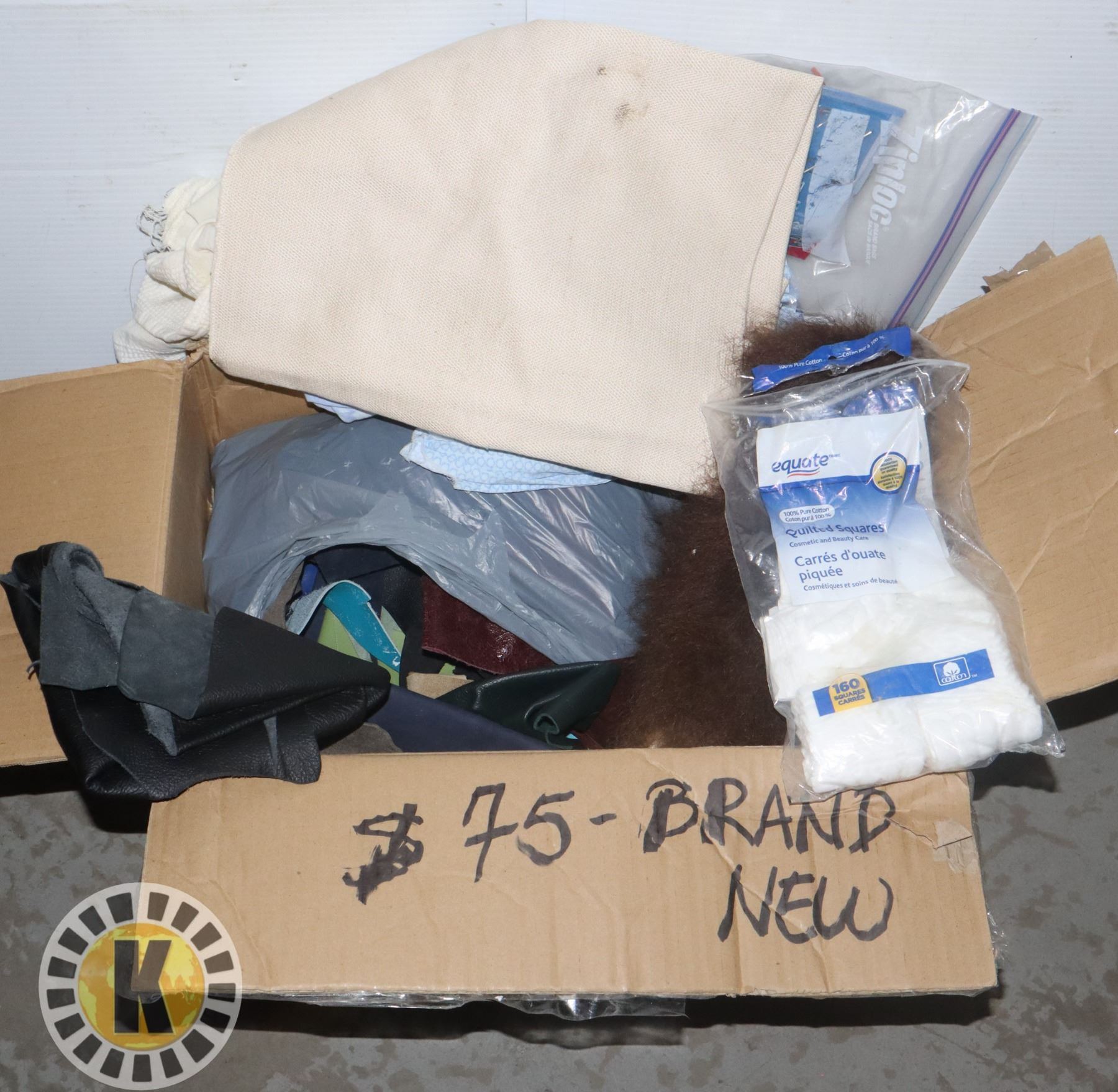 BOX OF ASSORTED MATERIALS FOR CRAFTING/SEWING ETC.
