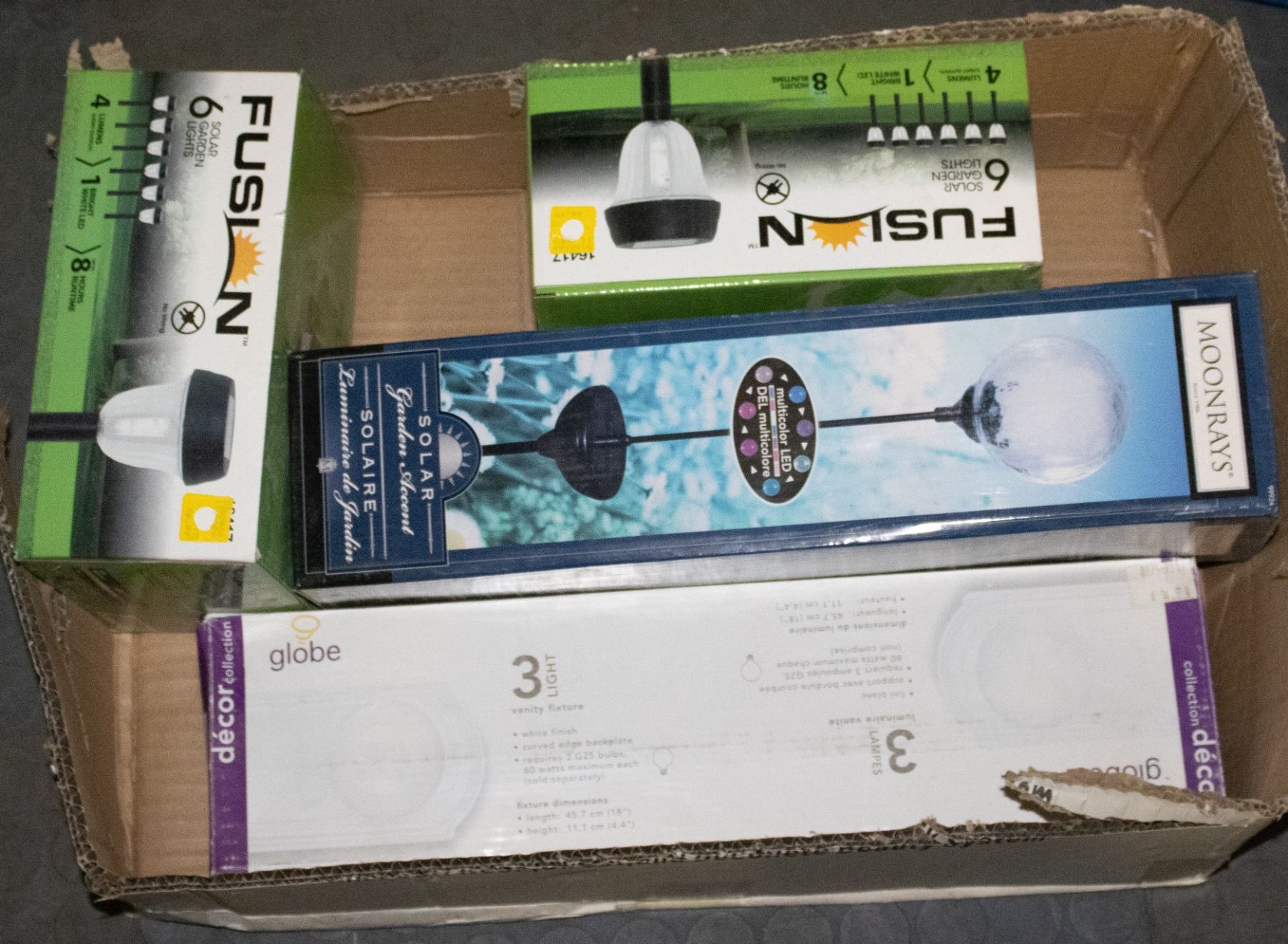 BOX OF ASSORTED PATHWAY LIGHTING & VANITY PICTURES