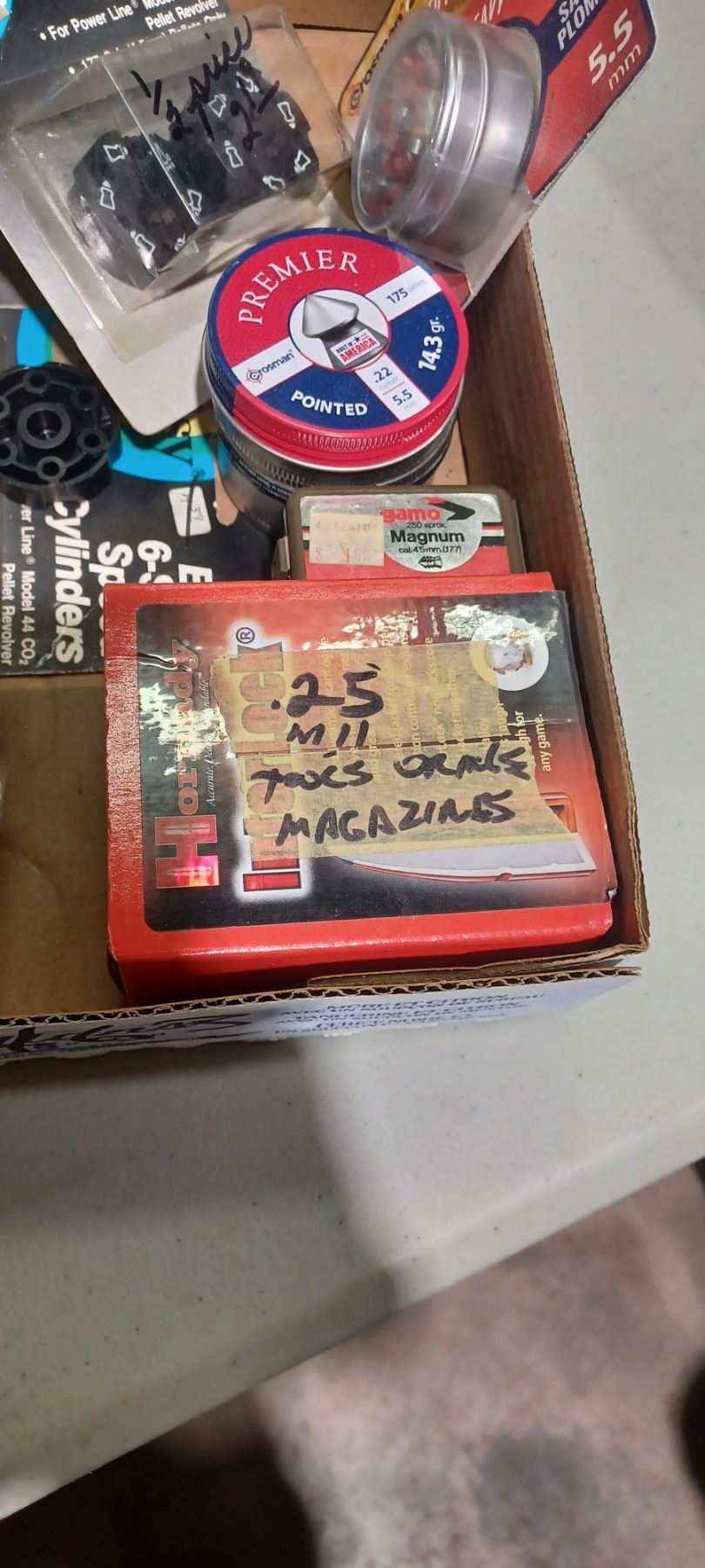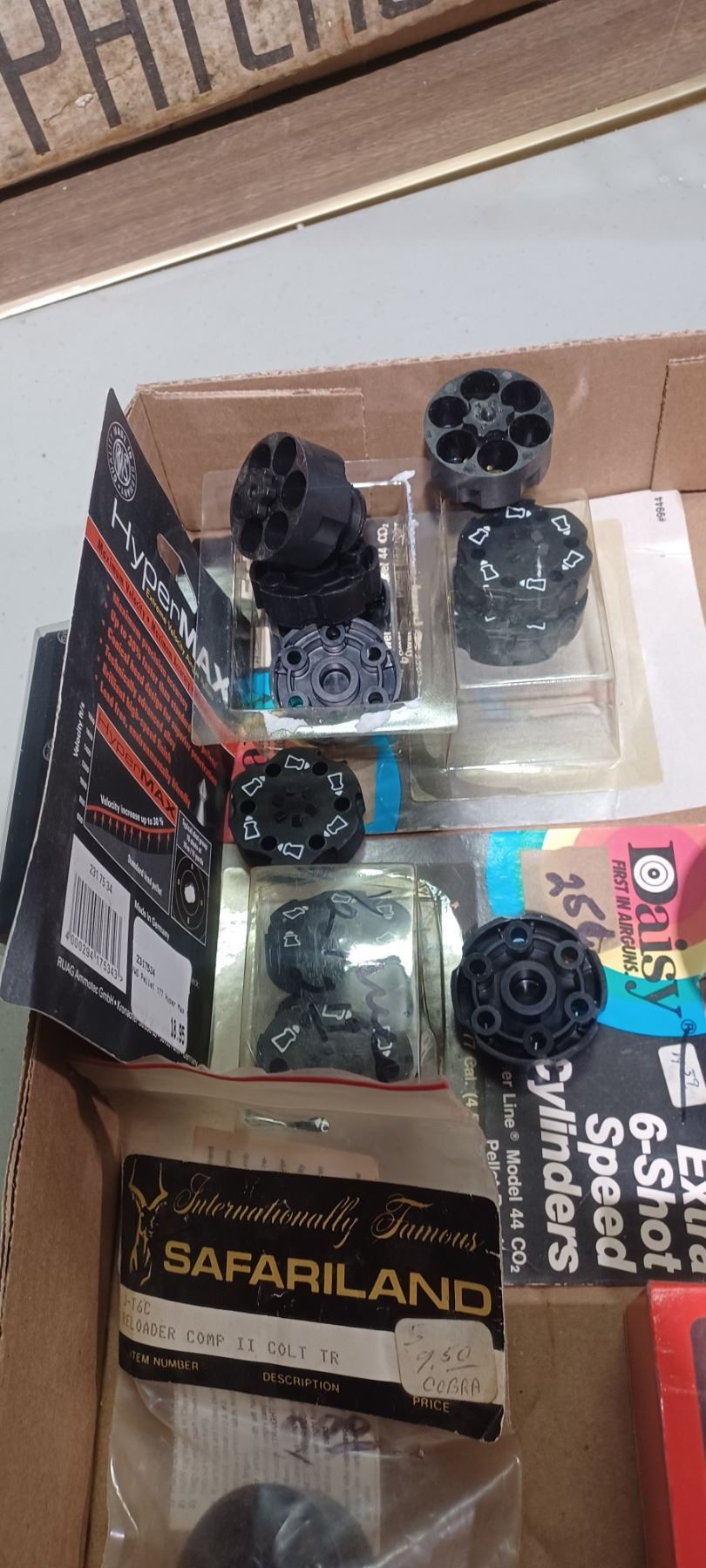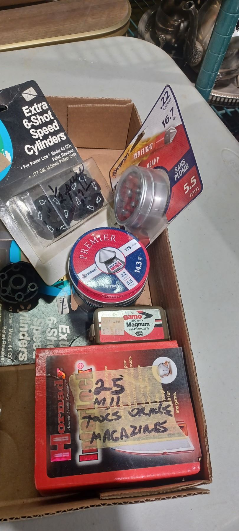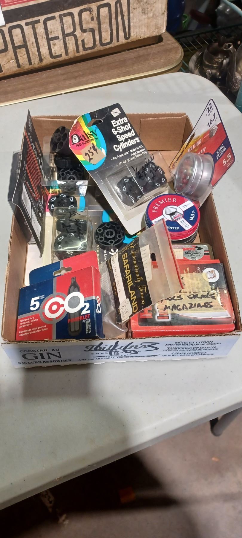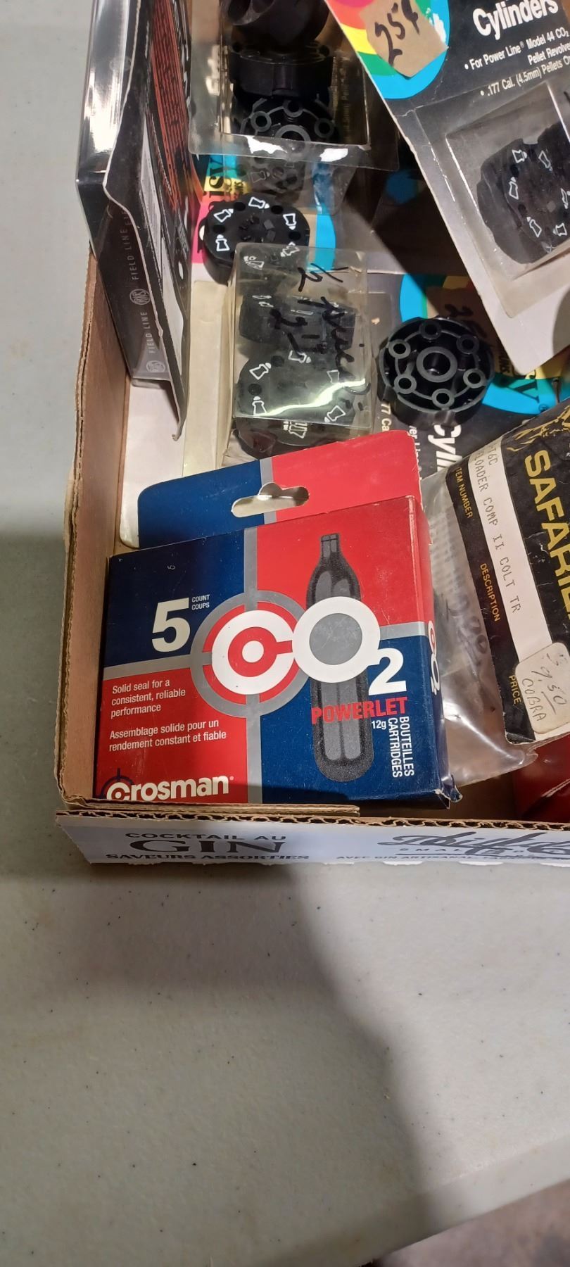 BOX OF ASSORTED PELLET GUN ACCESSORIES. PELLETS AND CO2 CYLINDERS