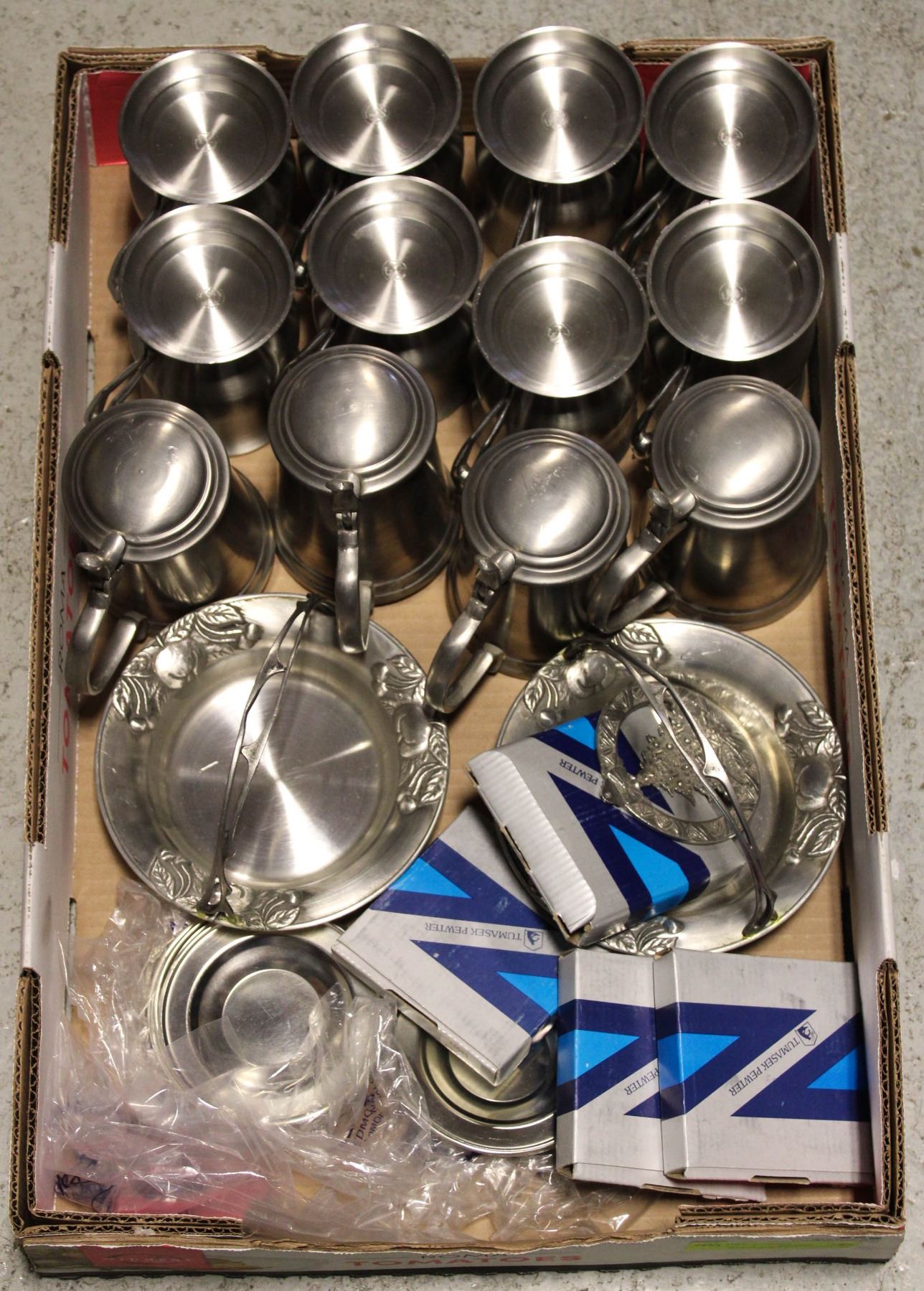 BOX OF ASSORTED PEWTER WARE INCLUDES MUGS